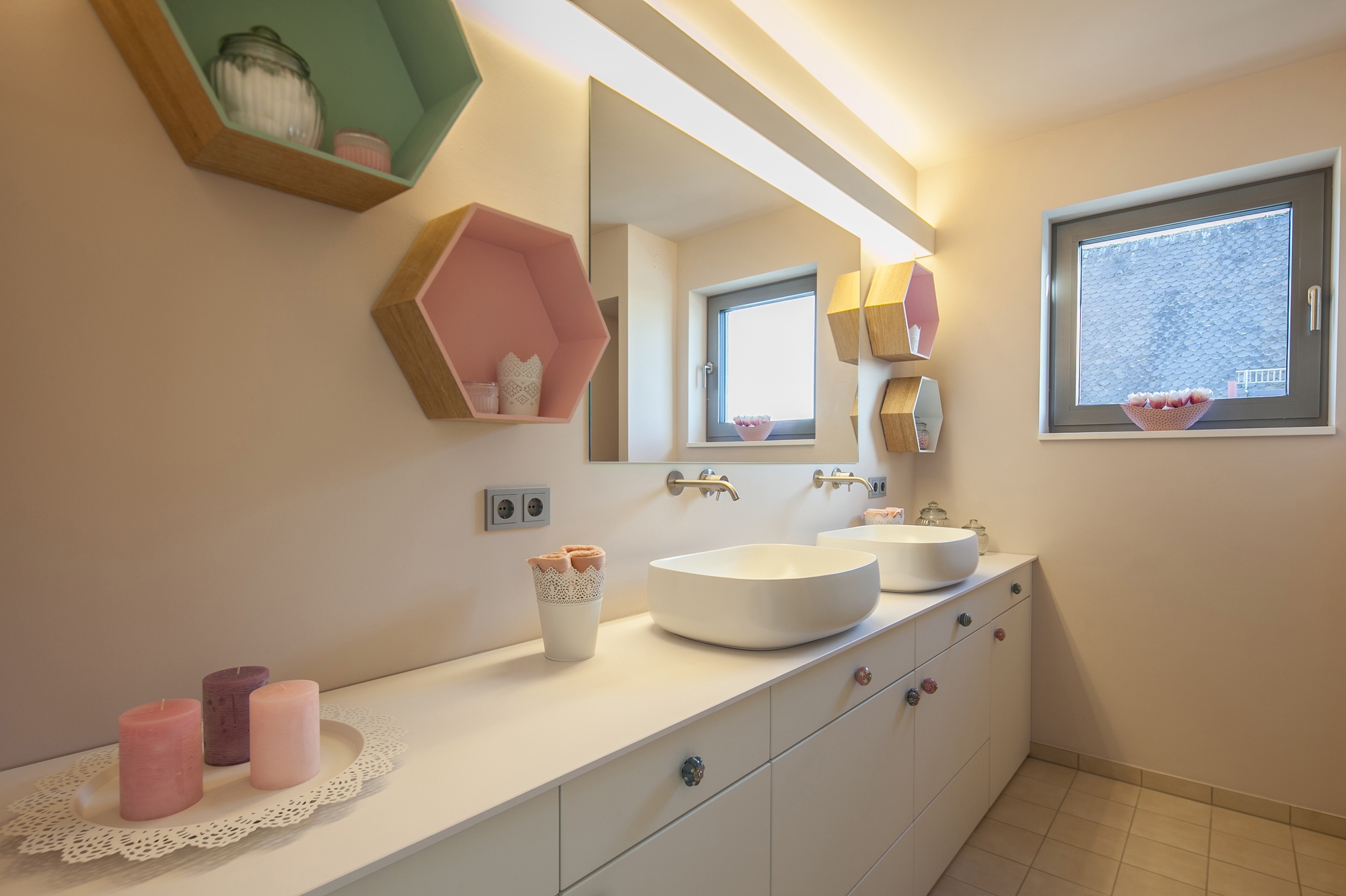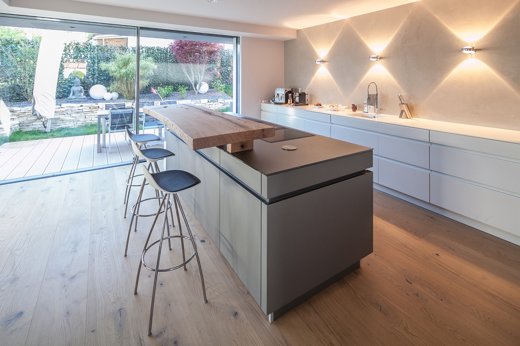 White, grey and oak - restrained and yet self-assured with the help of clever details: that was the world of colours and materials of the installations for a modern new construction villa. The only runaway is the wine cellar: the colours stayed, but the atmosphere is quite different. By the antique herringbone floor covering, the round arch door and the wine rack in black steel one feels taken back to bygone days.