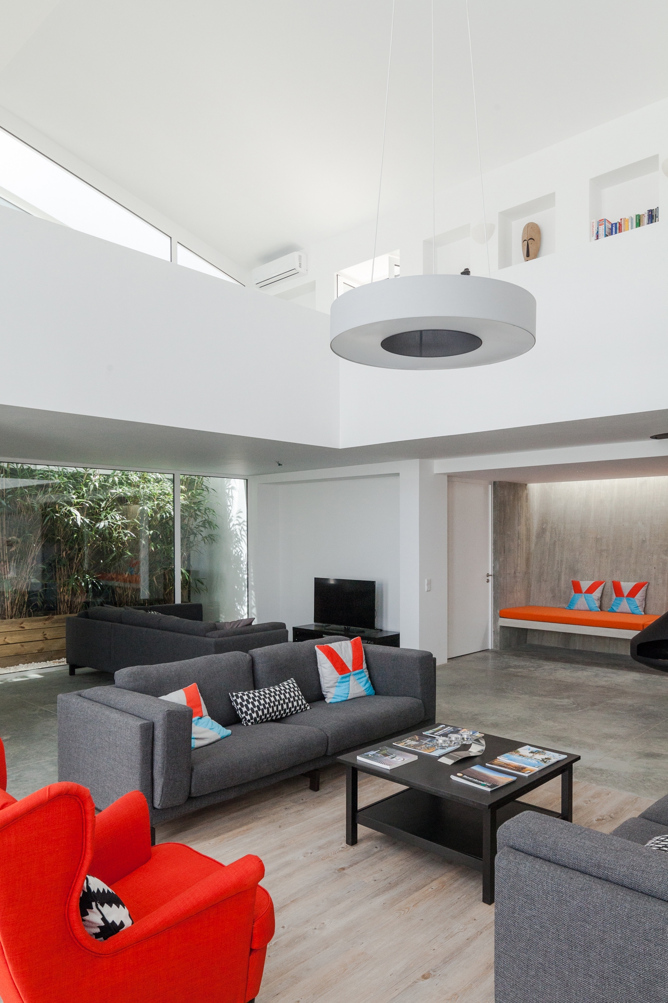 In the upper level, the intervention consists on recovering and expanding the existing building for owners' house. The planimetric composition is made up by a succession of spaces, which ends with a double height common lounge with a central fireplace. On the north-west side are located the main entrance and supporting spaces intercalated with small garden courtyards for natural lighting and ventilation. On the south-east side, to the contrary, are located the main spaces overlooking the garden and pool.