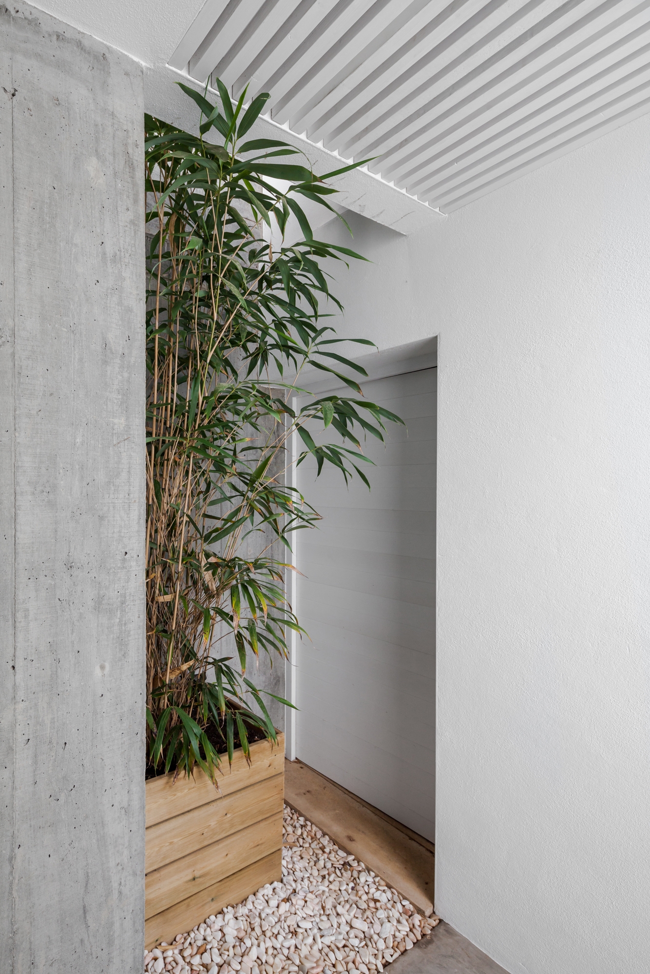 In the lower level, the intervention results in a new independent building that adapts to the topography of the site and uses the slope of the ground to differentiate the owners’ house of the guest areas. This long volume, half-buried and perpendicular to the line of trees, preserves the scale of the house and reinforces the verticality of vegetation. Its unique façade is characterized both by a wide opening framing vistas of the landscape as well as by a stand-alone pergola reducing the amount of direct sunlight coming inside the rooms and providing privacy for guests. At the level of arrival the building is almost imperceptible to the eye, only a long terrace with seating areas for contemplation of the surrounding nature is visible.