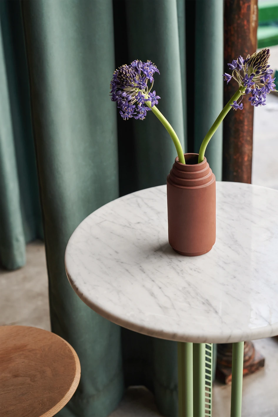 It is a métier of T3 studio to design custom furniture elements to fulfil the unique requirements of a space. For Persil, the marble tables (a classic Parisian staple) designed by the Berlin studio and built by local mobilier Adrian Ducerf are given new vibrancy with a laser-cut metal base that shapes light and shadow. A custom communal wood table with vintage chairs sourced from Berlin, and surrounding velvet drapes, add softness to balance the stone walls. The heart of the restaurant is the ceramic-lined, oak bar designed by T3. Vertical timber detailing, awash in soothing green, creates a feature wall to the rear of the bar while concealing much-needed storage. Additional seating nooks with a Bohemian flavour provide a relaxed atmosphere in the spirit of artistic exchange. It’s all about comfort and T3’s design for Persil achieves just that.