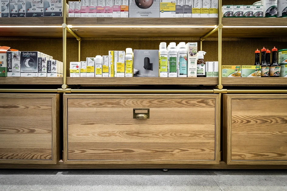 Spanish pharmacy designer collaborates with P&G Konzept to create unique pharmacy landscapes, elegantly bridging the sales areas of medicine, beauty, and natural pharmacy. The pharmacy designed by Creative Director and Designer Alejo Lozal of Apotheka Spain combines P&G KOnzept's tube connection system in brass matte with oak wood shelving and drawers. The shelving unit, divided into two sections using tubes, offers the opportunity in store design to cleverly position the sales area and storage within one space. Alejo Lozal's design is a prime example of a successful store design concept that intuitively combines functionality and design.