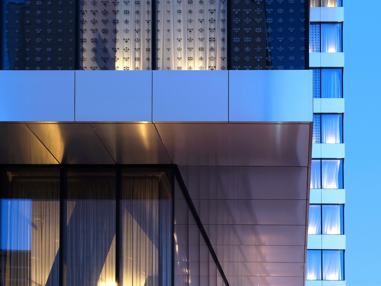 The opaque aluminium horizontal elements contrast with the transparent glass panels, diminishing the presence of the building in the urban context. The aim is to incorporate the building to the existing urban context creating a cityscape. It is more an aggregation to the existing towers than an element that stands out as a contrast. Glazed areas are “shaded” with pixelated Slovene motif patterns in the form of an abstract curtain.