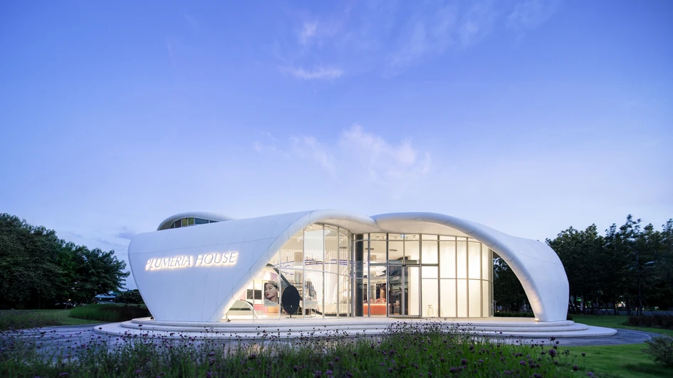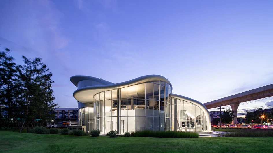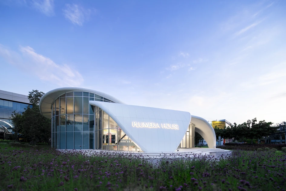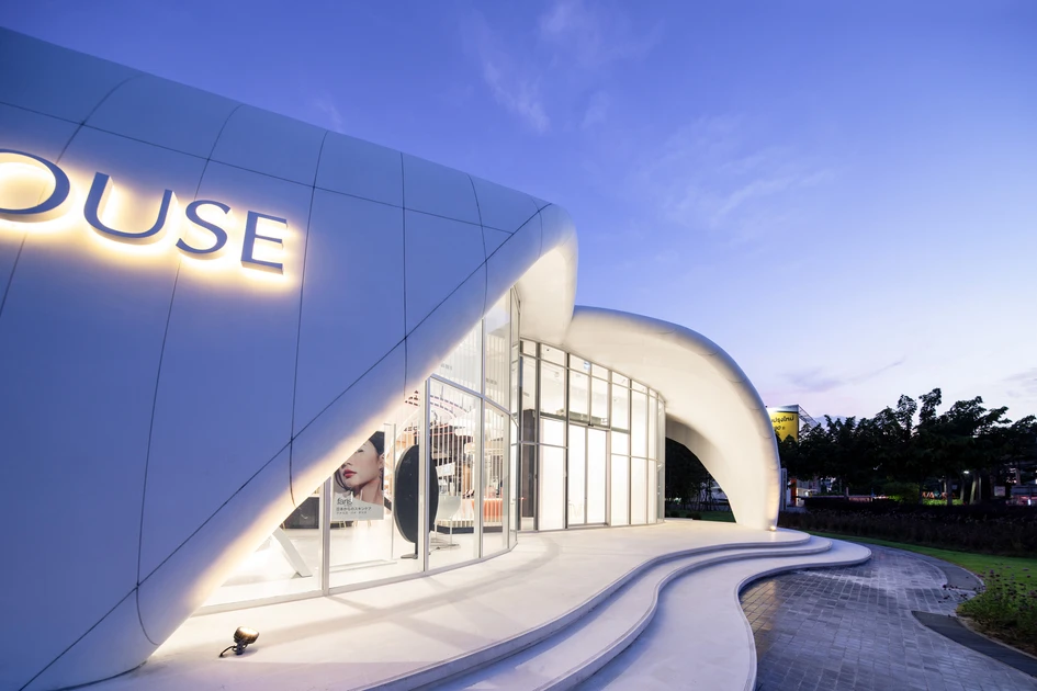 Taking inspiration from the wild plumeria flower, the structure interconnects with nature in the most beautiful forms. There is a sweet yet bold connection of this structure with that of the building function embedded. The house holds a function of cosmetic retail - the Mistine Brand that swiftly aligns with the overall concept of the structure. Furthermore, amalgamating the framed, tall, and durable glass with panels of Staron Solid Surfaces, the facade stands in pride - exhibiting a modern and contemporary appeal. The 12mm edge in Staron Bright White enables an organic experience while molding the facade into an absolutely intriguing biomimetic form.