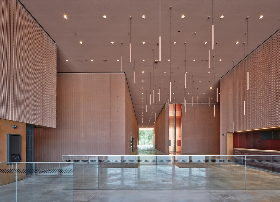 The WXCA architects also alluded to motives of military symbolics in their concept, which was expressed by a geometric, disciplined form of structures of the Polish Army Museum and their compact organisation from two sides of the square of the Polish Royal Foot Guards. The South Building was the first to be completed. Its architectural expression is defined by physical and visual properties of the applied materials and the method of working them. The architects decided to use coloured architectural concrete that refers to the brick walls of the Warsaw Citadel. The designers broke up the monumentality of the structure by a specially designed pattern that was imprinted on the surface of the massive blocks. This chevron pattern was intended to subtly invoke military motives. Its spatial form was conceived as a surface for the sculptural interplay of light and shadows that change depending on the time of day, thus, transforming the overall perception of the building. The size of a single module of the ornament was designed by the WXCA architects with reference to a human scale, specifically, that of a human hand, which results in a gradation of the aesthetic experience – when approaching the monumental, rigorous body of the building it is the façade detail that first comes to the fore. The South Building of the Polish Army Museum comprises eight functional blocks. Four of them are intended to house the permanent exhibition. The three largest blocks are dedicated to the history of Polish Arms, from the beginnings of Poland’s statehood right up to the end of the Second World War. The fourth is devoted to the oriental weaponry collection. The fifth block, considered the heart of the museum, houses the Temporary Exhibition Hall – a space meant for special events and commemorative exhibitions. The variability of this hall will be a reason to keep returning to the Polish Army Museum. Close to 6,000 m2 of exhibition space will be complemented by three blocks: one for visitor services and facilities including office and administrative facilities, an audiovisual block with a capacity of up to 100 people, and a warehouse and technical office block. The interiors rely on the spatial tensions between specific building bodies and the spaces between them. As a whole, it was designed as a minimalist background for the presented exposition.