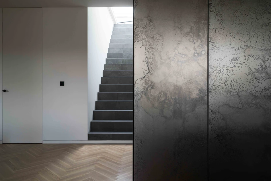 The material palette is diverse, combining metals and ceramics with colour gradients ranging from deep blues to soft pinks. The striking contrast of oxidised steel and stone complements ceramic tiles inspired by traditional stoves, serve as decorative focal points throughout the bathrooms and living spaces.