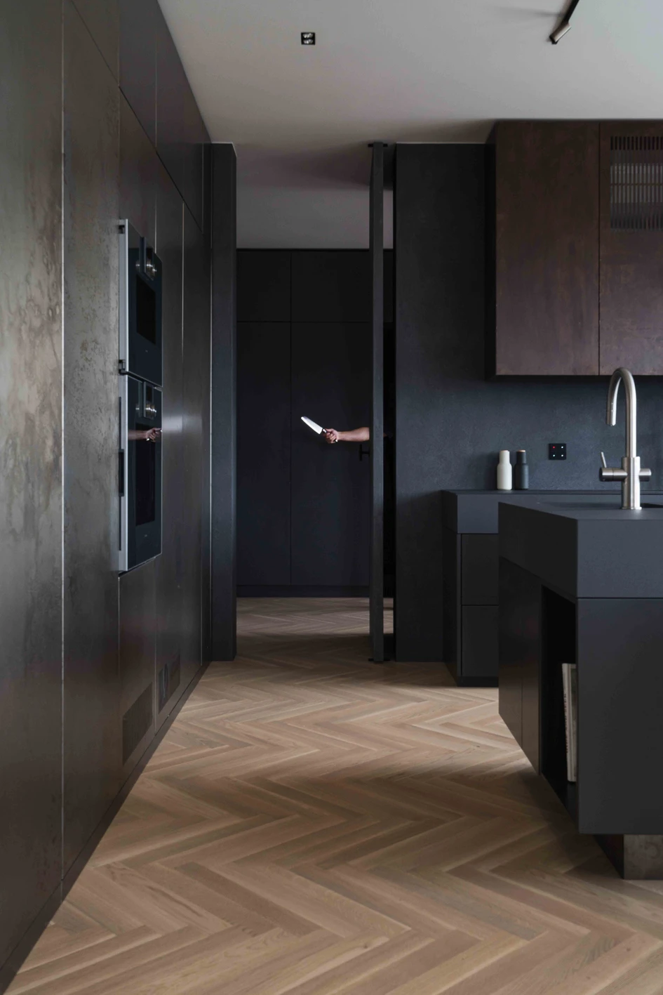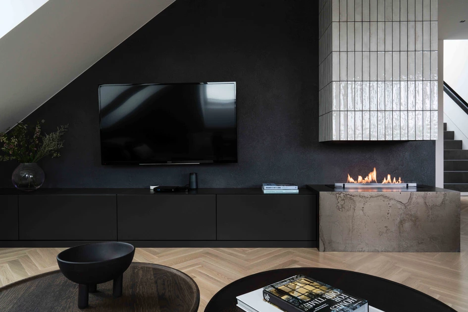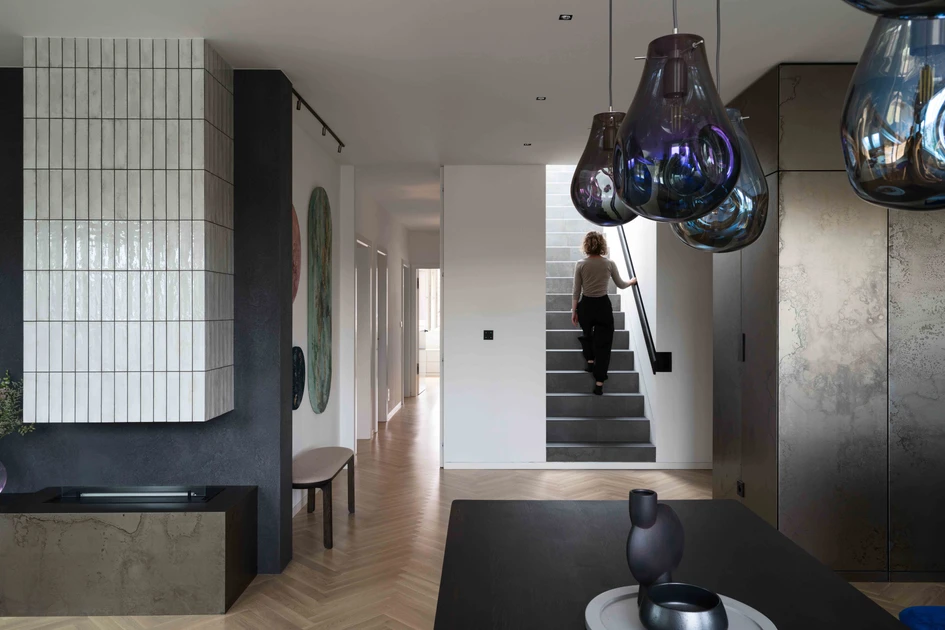 Situated in a newly constructed rooftop extension (168m2) of an old apartment building from 1893, the apartment offers sweeping views of the city. The open-concept living area seamlessly connects the entry, dining, and lounge spaces, emphasising spaciousness and light. Upon entry, visitors are greeted by Alina Shupikov Soul of Immigrant artworks that incorporate soil and sand from significant locations in the couple's lives, including fragments from their childhood school.