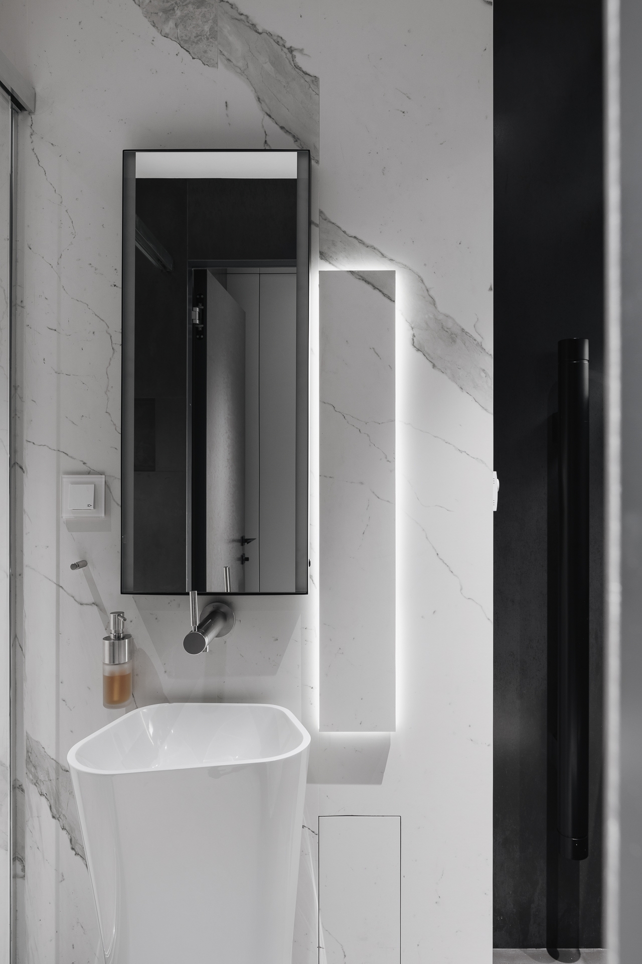 The exhibition can be viewed from both sides. When choosing the line of sight and the appropriate installation,the pre-set lighting scenario is enabled in the room. Depending on the event and as an option, the user can adjust the light power and intensity. Porcelain stoneware slabs 3 x 1 m were mainly used for floor, wall and furniture decoration, which made it possible to avoid excessive joints and create a seamless surface effect.