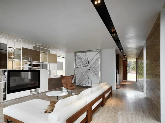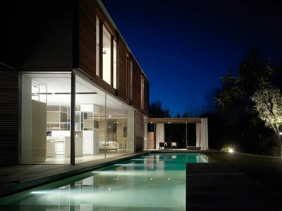 A villa in Forte dei Marmi that displays a balance between luxury and sobriety, elegance and sense of measure, rich materials and attention to detail, in a rigor of an essential atmosphere. The enclosure opens to the landscape, crossed by the fluid space that includes the living area, the garden and the swimming pool in a single environment. Inspired by the Roman villas in Versilia, the path of access is formed by slabs of Travertine, simply resting on the ground. The internal route from the entrance area penetrates the entire house, with Travertine stone for the floors, a material that returns in horizontal strips for the wall in front of the full-height boiseries in Burma teak.