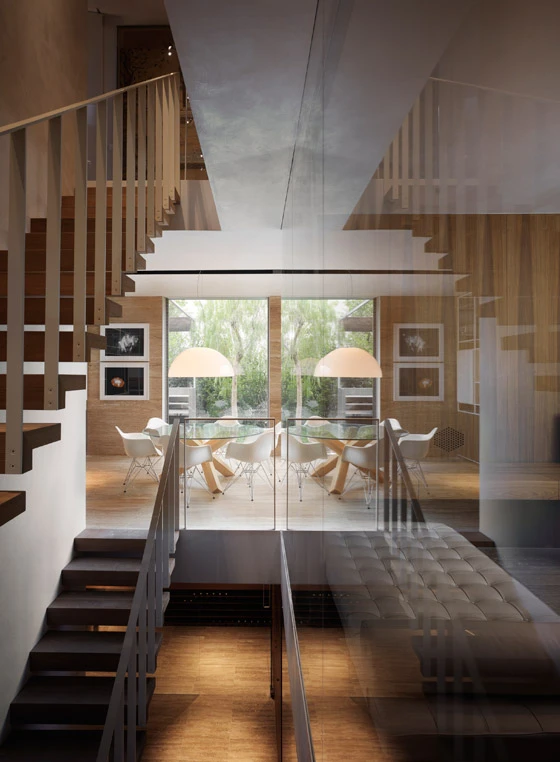 The fitness zone opens on a spectacular glass wall containing the volume of water of the outdoor swimming pool reflecting the filtered light on the adjoining mirroring wall.