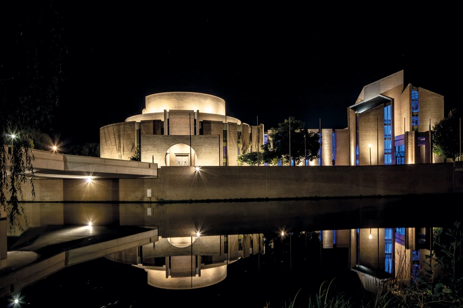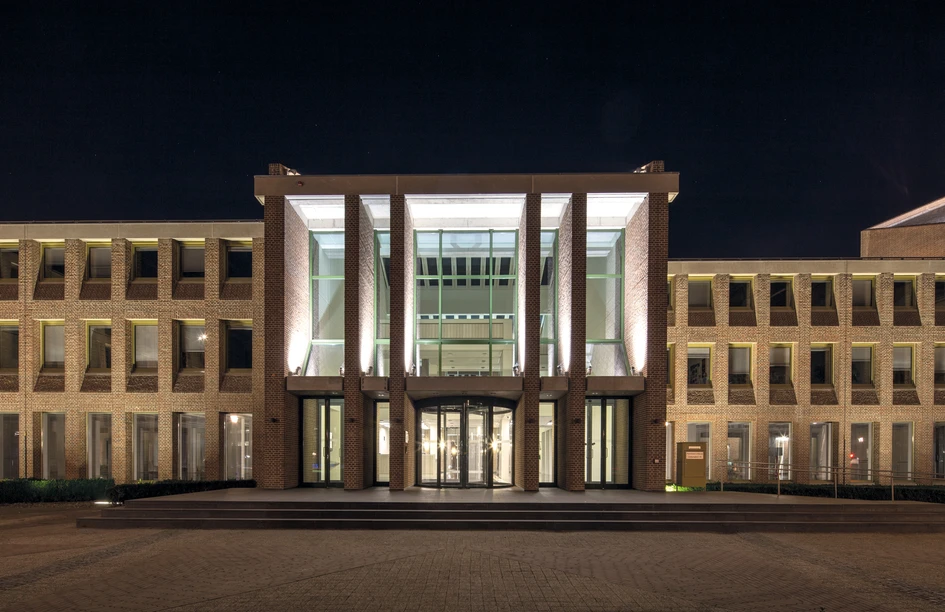 The lighting concept was specified so that floodlighting emphasises the cubic and monumental building style. Important building sections such as the assembly room and entrance area are more conspicuously illuminated to underline the hierarchy of the building structure.