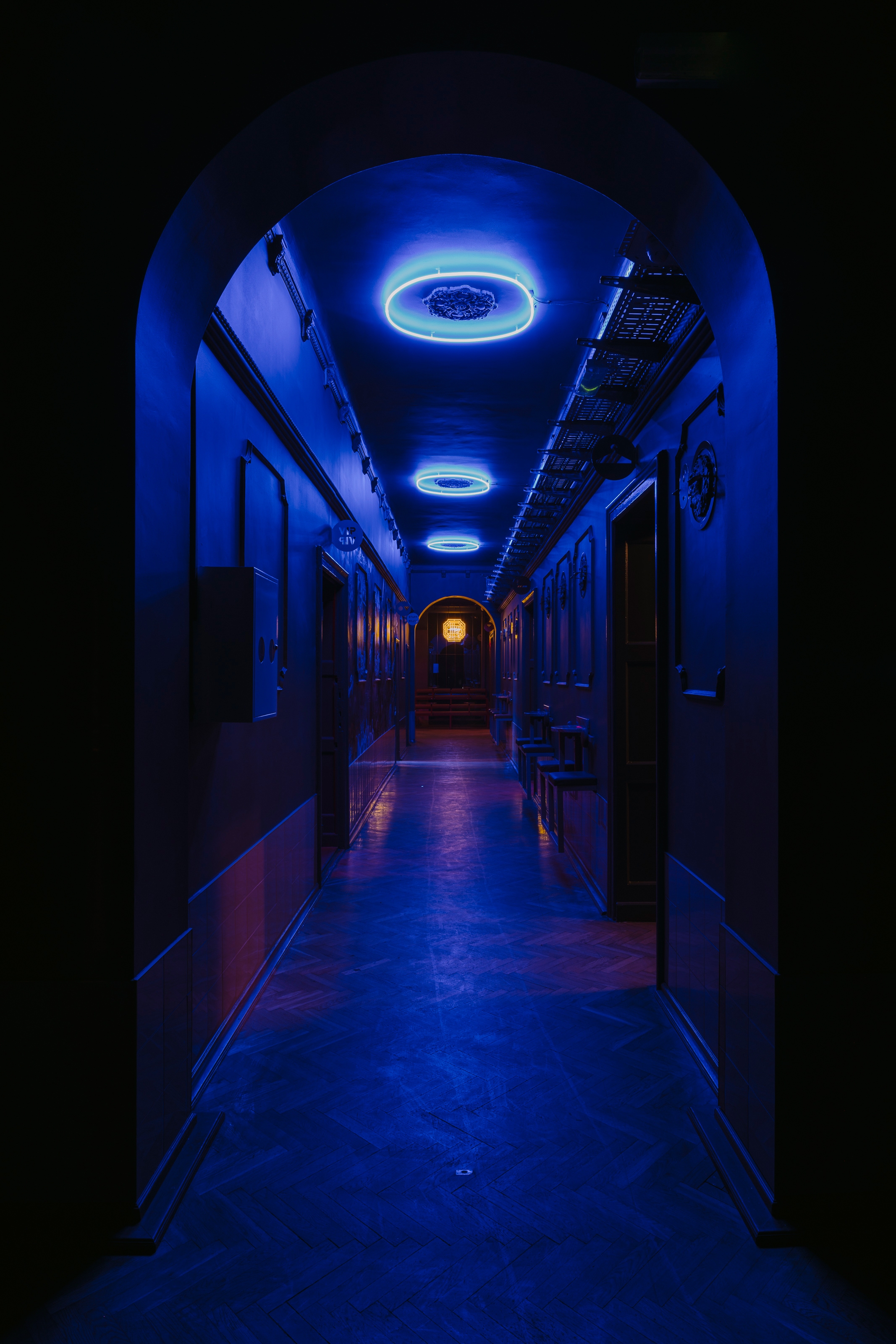 We have filled this space with over 50 furniture designed by us, like an art gallery space. In the corridor, for example, we designed barstools with tables that are hung on the wall for security reasons and for easy cleaning. Valuable decorations on the corridor's ceiling were highlighted with blue neon rings. At the end of the corridor there is a grandstand for sitting and observing guests and a shotbar with a huge geometric chandelier hanging above, which we also designed.