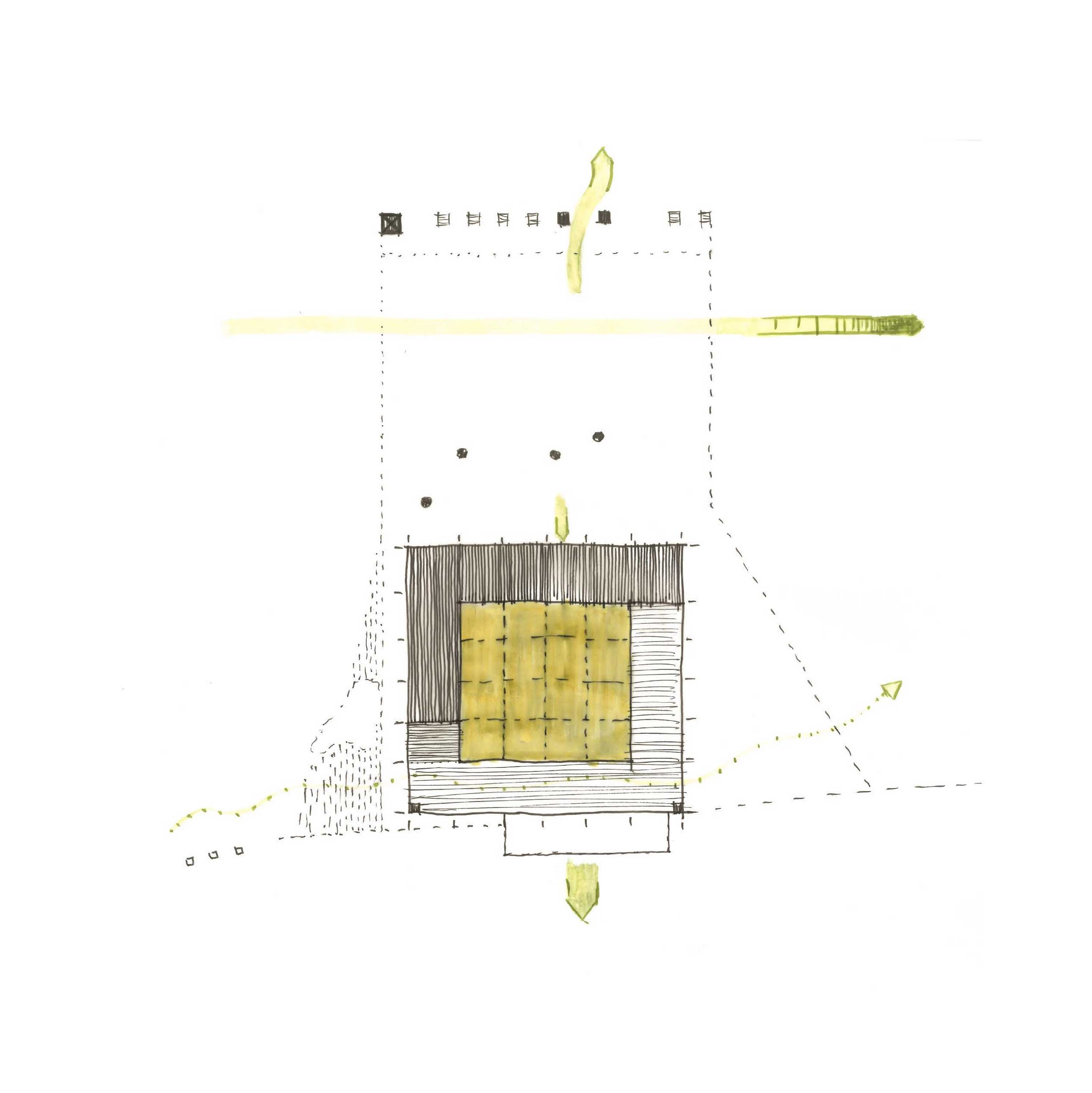 The proposed layout spreads across both sides of the access road to the saddle. On one side, the main building—"the house"—adjoins the parking lot and bus stop with a turnaround, serving as their facility and enrichment. On the other side, stands a new bell tower and the portal of a forest path connecting to the route leading to the Radhošť ridge. The bell tower symbolizes human presence in the landscape and embodies a spiritual dimension, summarizing the historical and contemporary relationship between people and this place. It also symbolizes the anchoring of the created place in the landscape. The paved area between the bell tower and the house offers seating under mature beeches. The entrance building integrates a small information center with a waiting room-café, facilities for parking lot staff, a bus stop shelter, toilets, and a terrace with a landscape view. It is situated on the edge of a slope, opening towards a view of Čertův mlýn (Devil’s Mill). The interior square central space of the waiting room and info-café is half bounded by a roofed terrace and half by the solid mass of the interior layout of auxiliary rooms. The bus turnaround adjoins the building, which automatically forms a shelter for the bus stop, allowing waiting inside during bad weather. The terrace with a viewpoint forms an interconnected whole with the interior, suitable for sitting in the summer months.