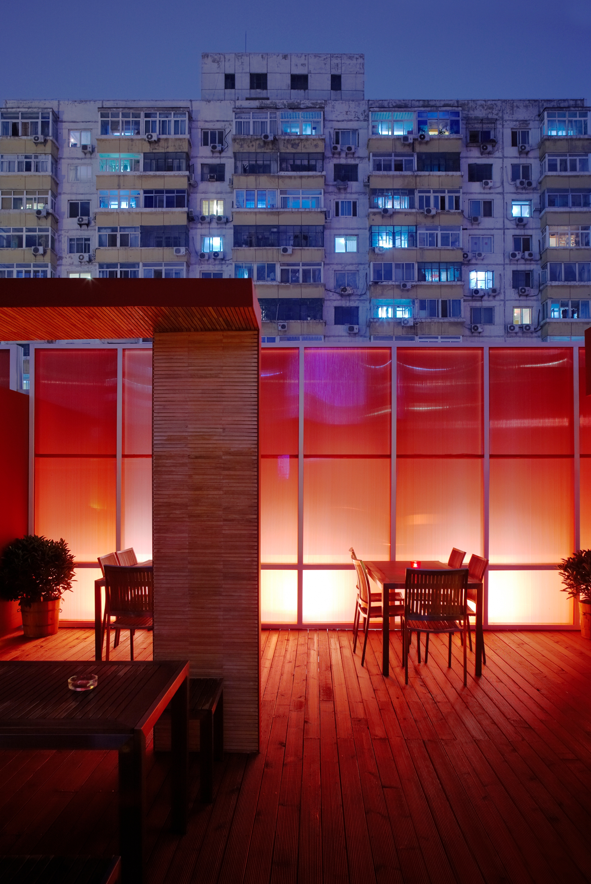 A second element is the bed-box. The initial idea was to frame the night views of the city. The box provides shelter and intimacy and it is also a practical storage during the winter season. As the interior space of Q Bar has a very simple concept with clear walls and only red paint the environment functions as a plain background for the bar crowd. The outdoor rooftop uses the same red combined with the wooden materiality. Only two main materials are used reduce the visual pollution.