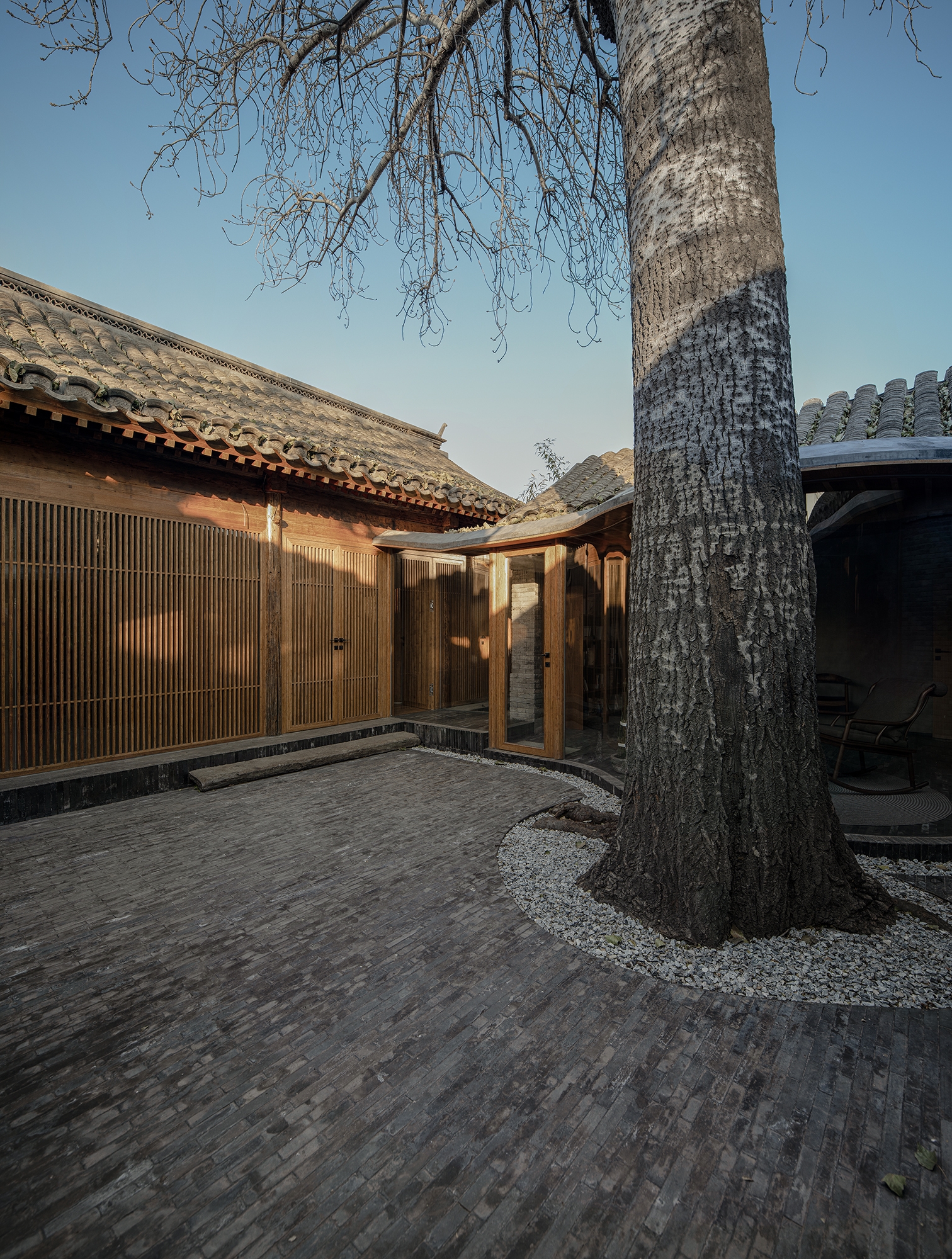 The front courtyard is mainly used as a garage. ARCHSTUDIO retained its pitched roof, removed the front and back walls, and shifted the entrance door to the side, so as to leave more space for parking. The design team restored and preserved many valuable historical elements such as the gateway and carvings of the arched door opening, and even a dry tree. In addition, the wall between the front and middle courtyards were dismantled and replaced by a transparent veranda.