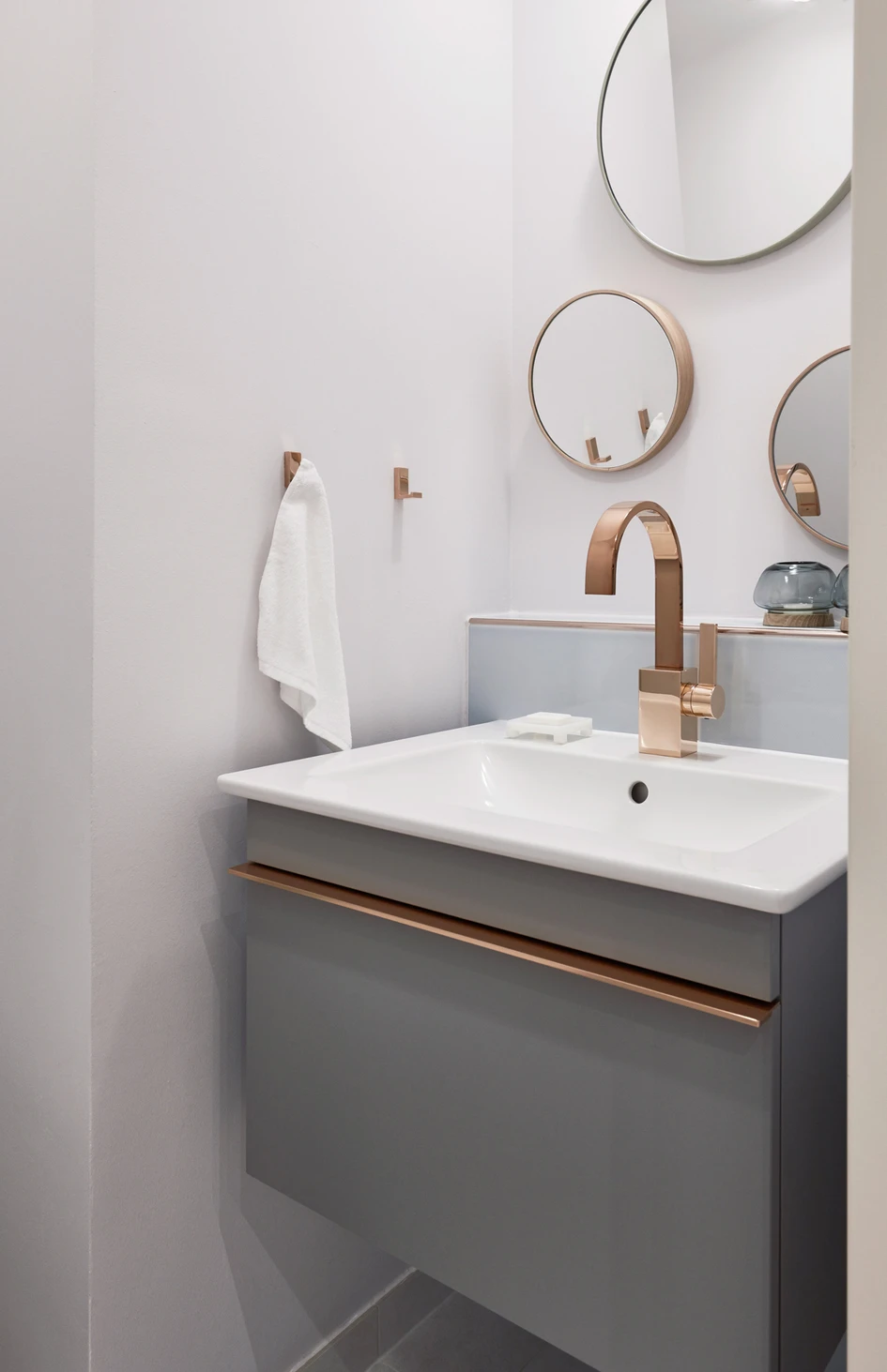 The separate guest WC is notable for its intelligent design details: the decorative strip on the tiled storage area takes up the warm copper tone of the handle rail on the sleek vanity unit which, like the large washbasin and wall-mounted rimless DirectFlush toilet, come from the Villeroy & Boch Venticello bathroom collection. The fine Stone Grey cabinet harmonises nicely with the rectangular wall tiles in the subdued colours White Polar and Frozen Lake and the light grey porcelain stoneware floor tiles. The high-gloss nonvitreous wall tiles in the fashionable 20 x 60 cm format from the Creative System 4.0 range, which won the Rat für Formgebung ICONIC AWARD 2017: Interior Innovations prize in January 2017, provide the finishing touch and give the room added breadth.