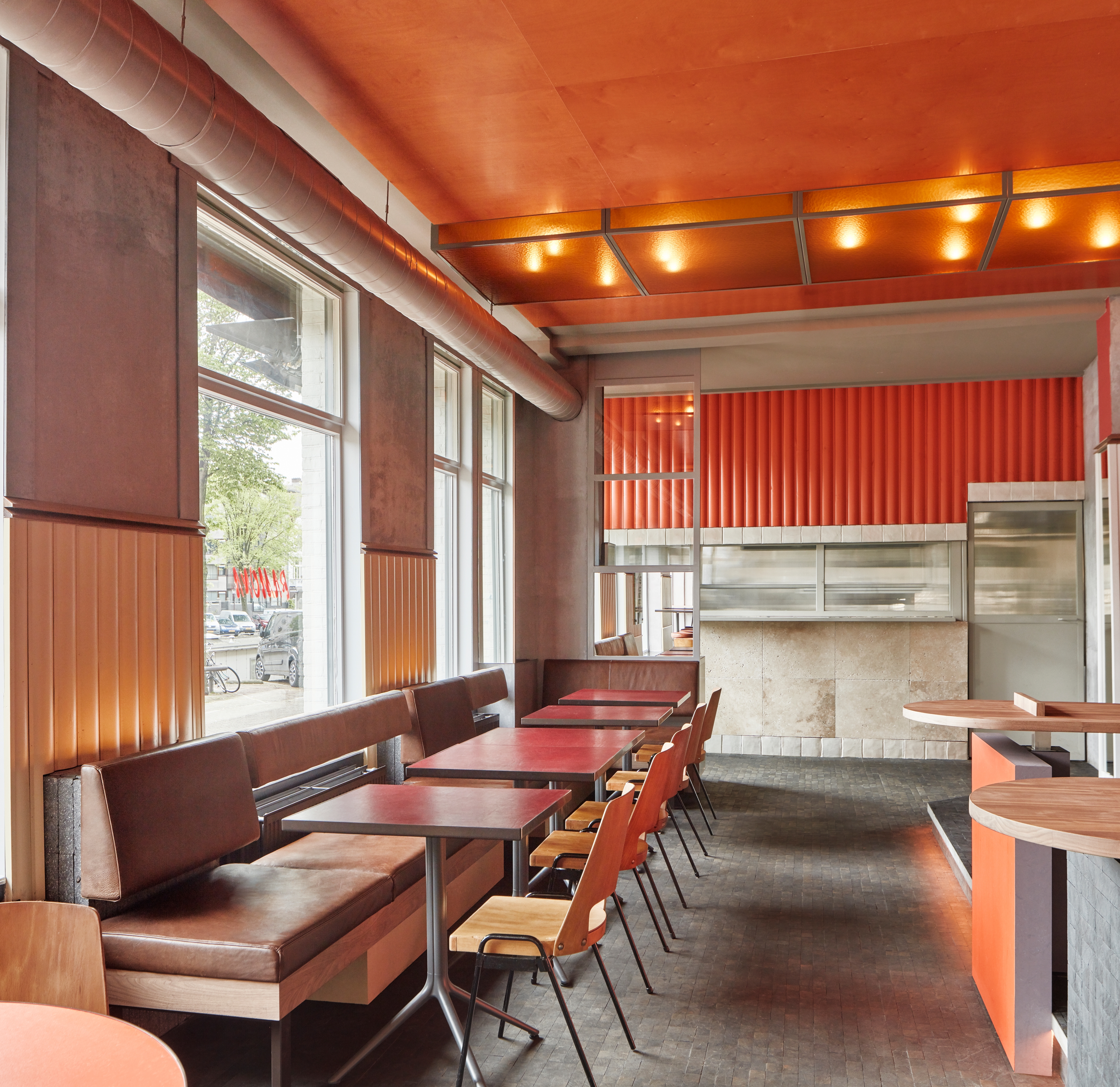 Ramona's interior is divided into four distinct areas. The bar, located directly by the entrance, gives the space a welcoming vibe. Further back the venue evolves into a bright eating area, with tables placed under large windows overlooking the sunny canal. A separate lounge area, with raised black marble tile flooring, breaks up the unassuming space. The kitchen, with upper part clad in bright orange panelling, is placed at the very back of the venue.