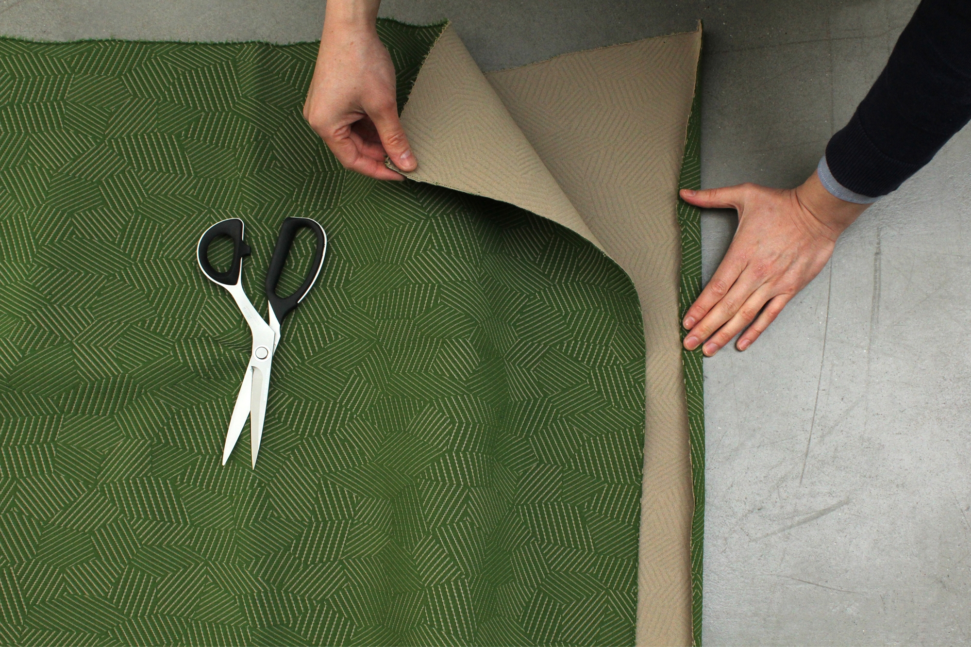 Named after the camouflage painting technique that inspired its complex pattern of intersecting lines, RAZZLE DAZZLE strikes as a lush fabric with a lively character. Groups of lines have been carefully rescaled and organised so as to compose an abstract and infinitely repeated pattern, resulting in a dynamic, rich and smooth fabric offering surprising effects depending on the viewers angle. RAZZLE DAZZLE comes in 3 variations: uniform, dual-tone, and mélange. Each type offers a unique presence and effect, ranging from subtle and quiet to highly graphic, thanks to colours and the three-dimensional nature of the fabric itself.