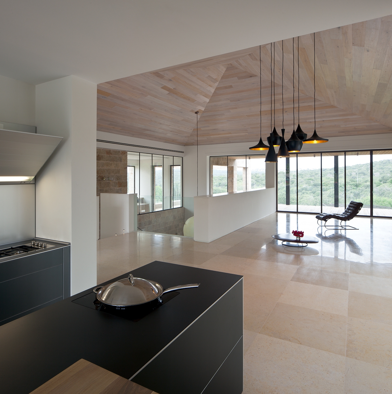 Slanted, pyramid shaped ceiling defines and connects the living area main space dining area and family room on the lower floor. The ceiling intensifies the outside viewing experience. The wood cladding is used to emphasis the ceiling unique shape.