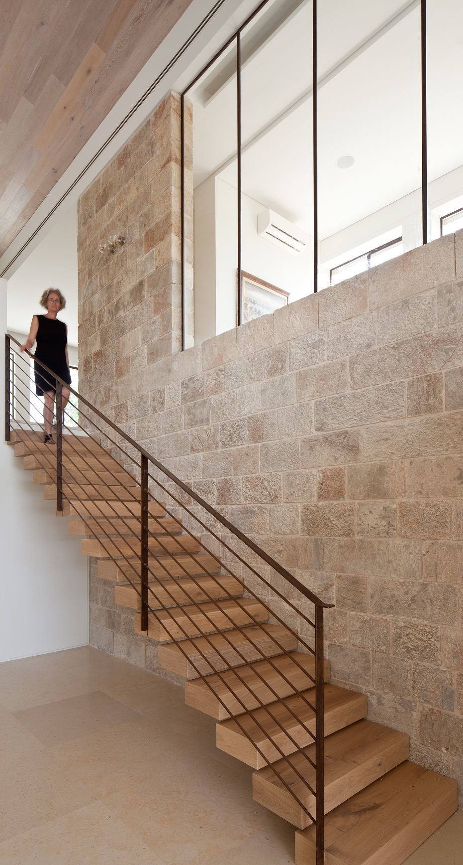 Outer wall cladding with local limestone carved in templar style, typical of the region. Cladding the staircase wall in stone is chosen in order to emphasize the connection between the upper level and the courtyard. Smoked Oak finish parquet covers the pyramid shaped ceiling of the main space. Rusted finish was chosen for metal parts including windows and entrance door. Aluminum cupboards.