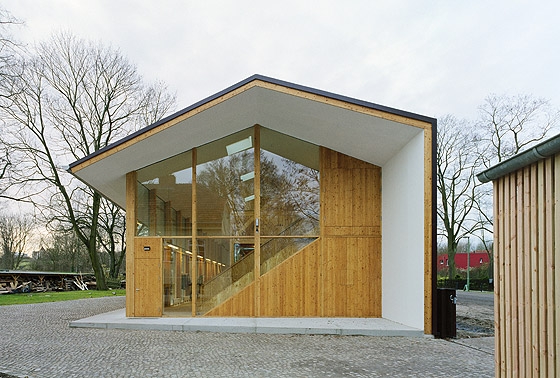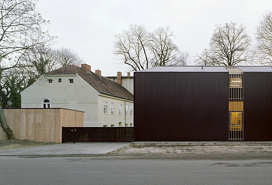 predominantly closed and only structured by vertical window slits. On the yard side the metal roof cantilevers