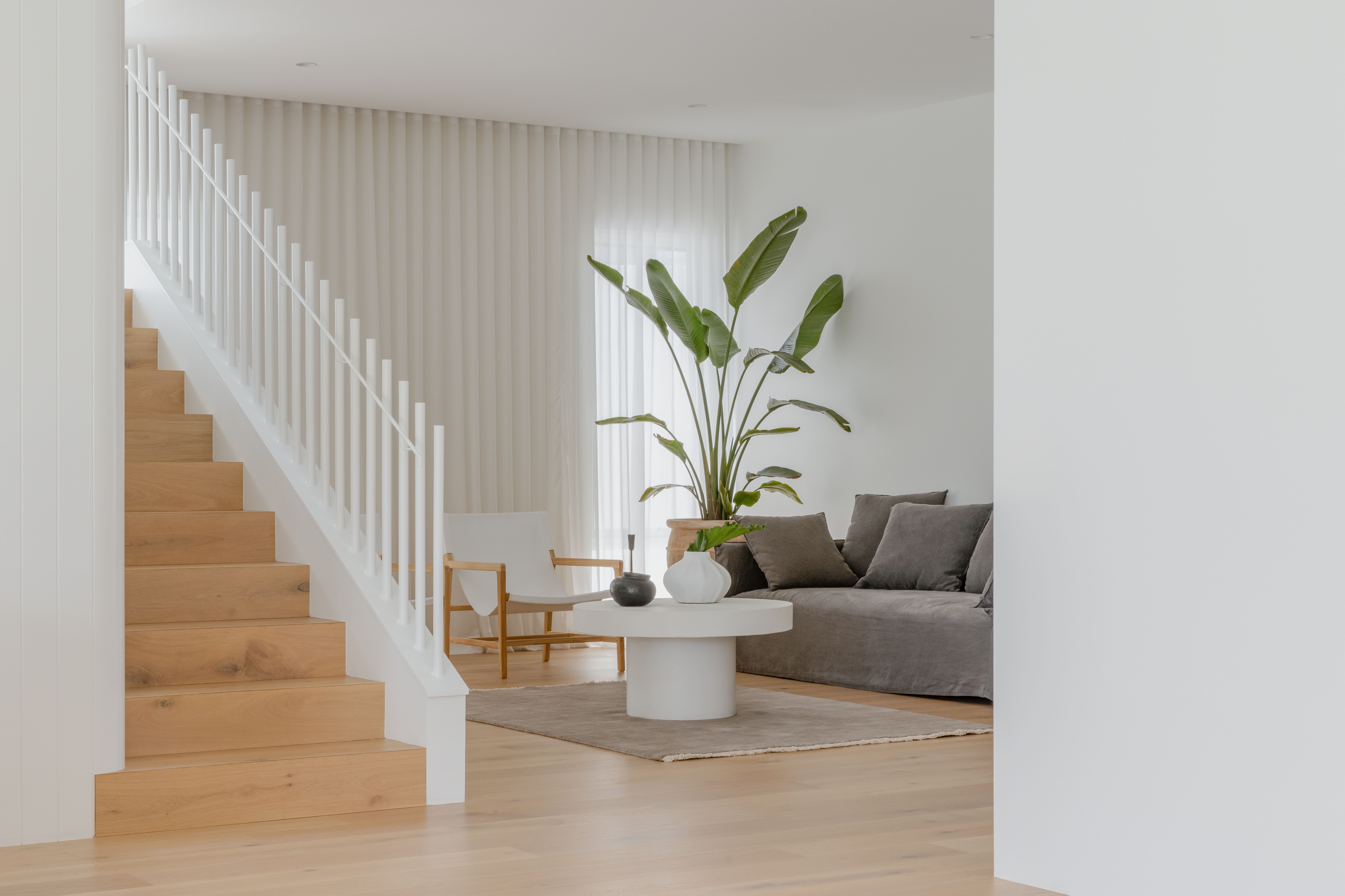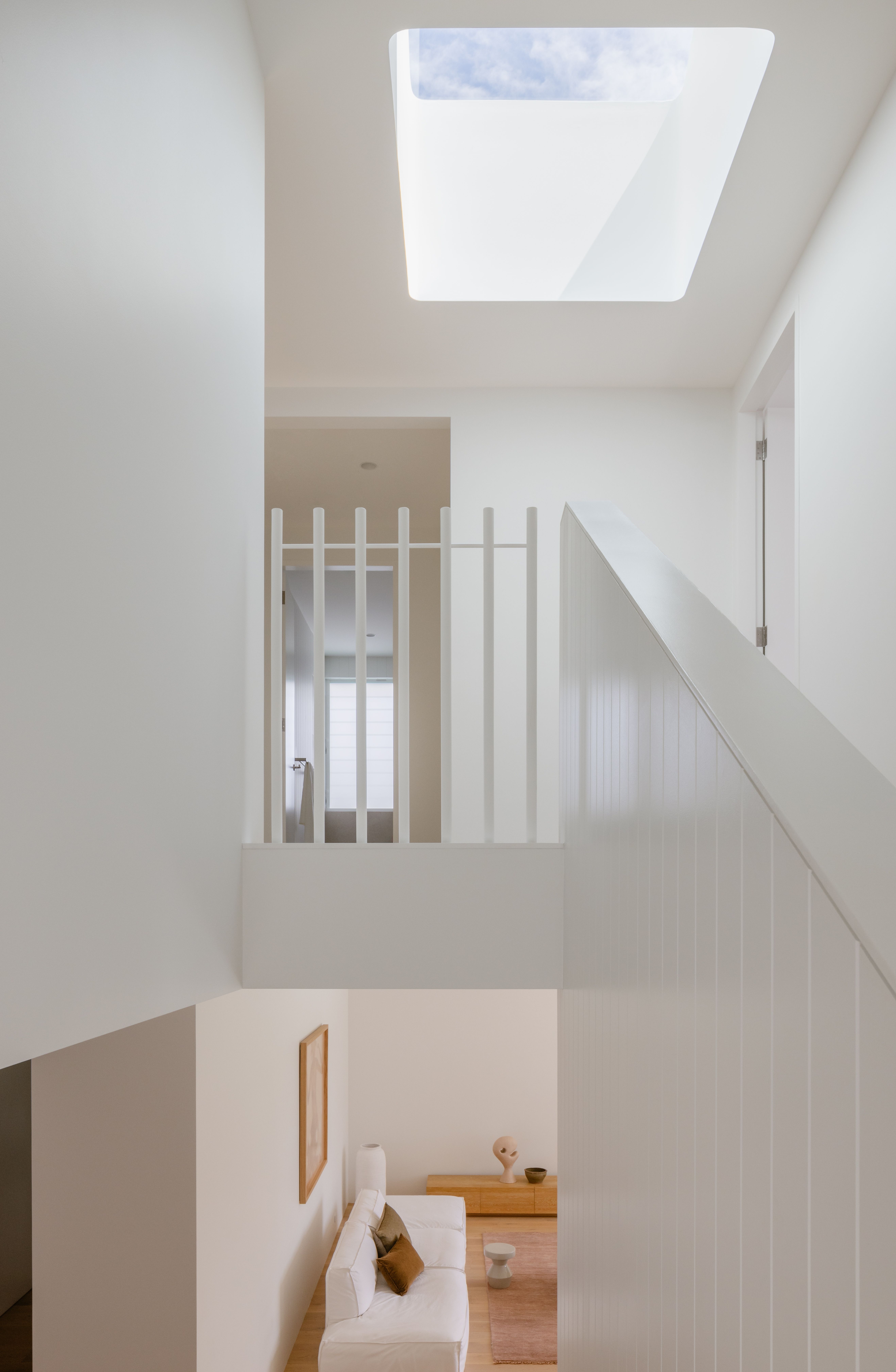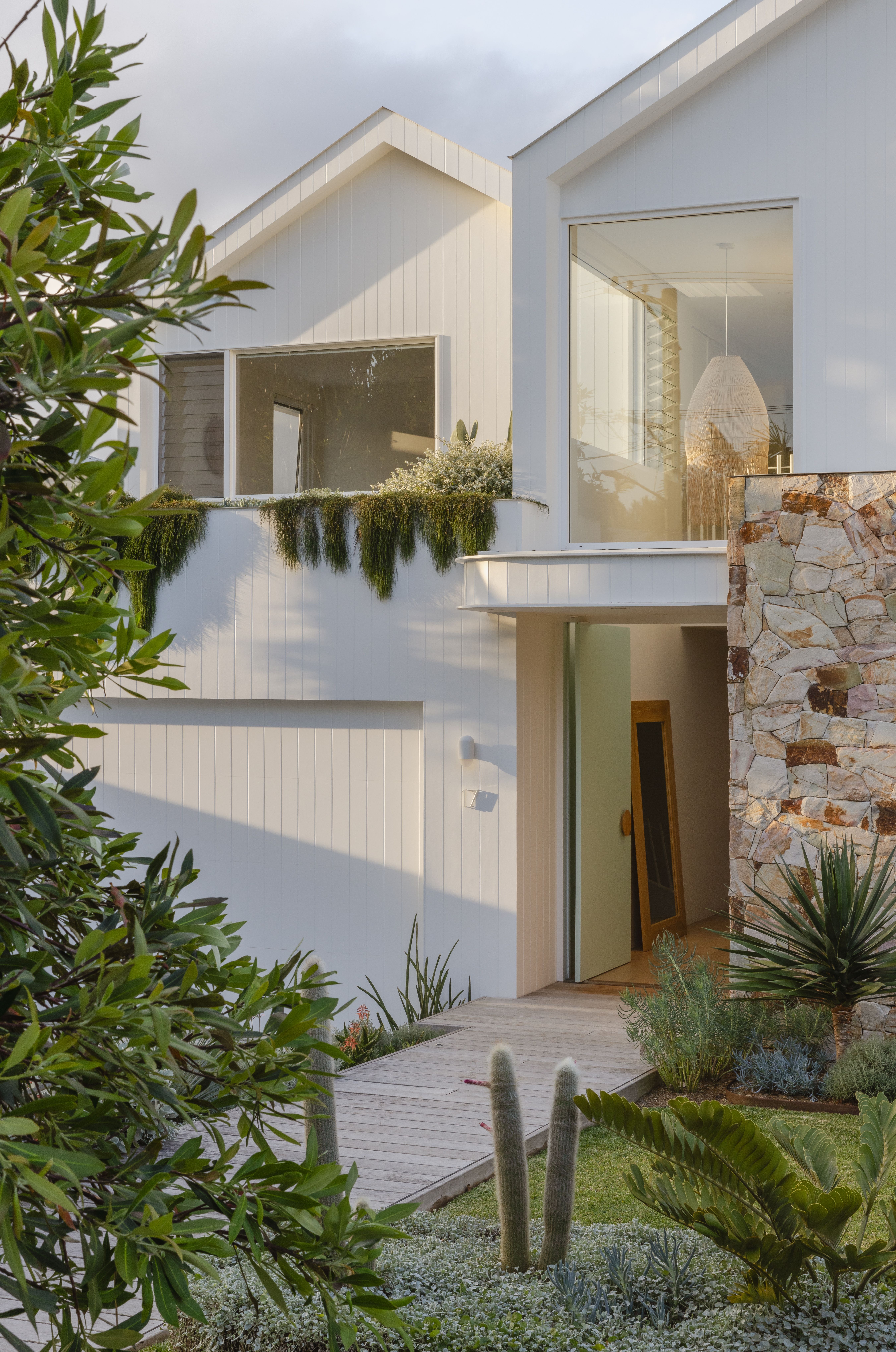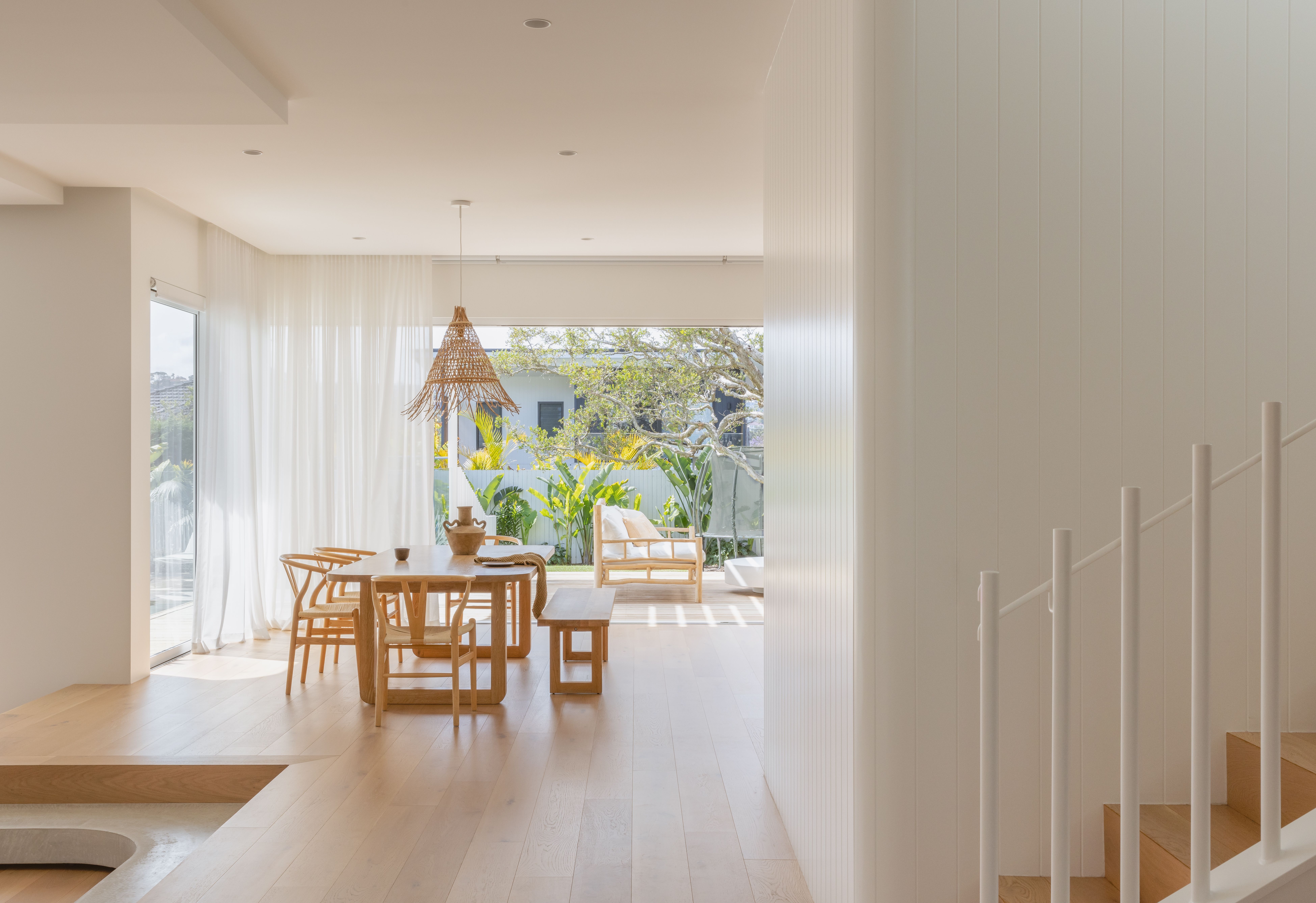 Aptly named after the meaning of the indigenous name of its location, River of Life sits nestled into the established coastline of Curl Curl (derived from the name Curial Curial – i.e. ‘river of life’) and celebrates both an open and connected modern liveability. Surrounded by traditional residential forms, the focus was to create a relaxed yet elevated sanctuary that was sensitive to the natural setting, while also having its own character. The reference to the double-gable silhouette pays homage to the existing context, reinterpreting the use of timber weatherboard panelling vertically instead of horizontally. The result emphasises the height and scale of the home, and together with a neutral and muted colour palette both internally and externally, an overall lightness elicits calm.