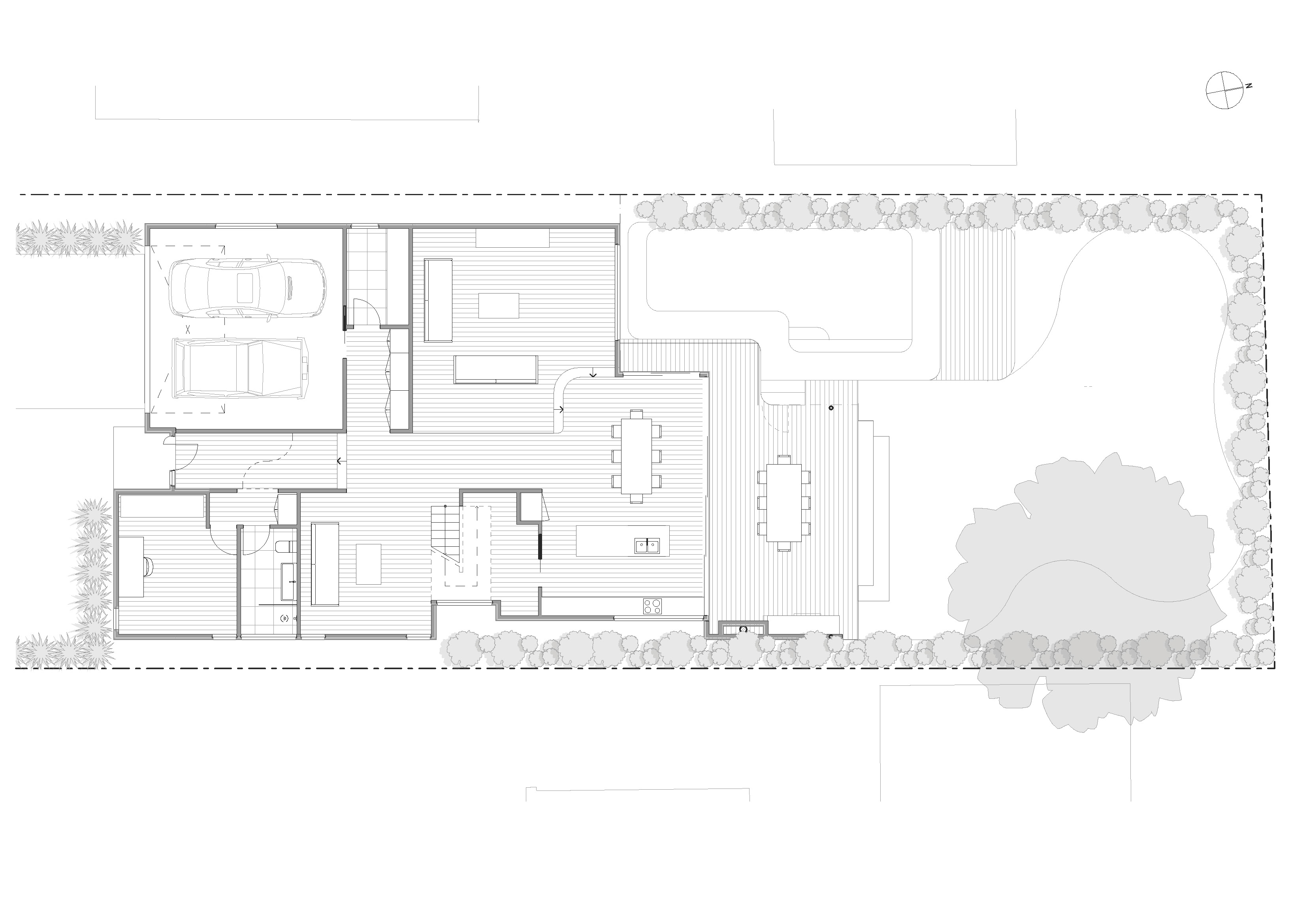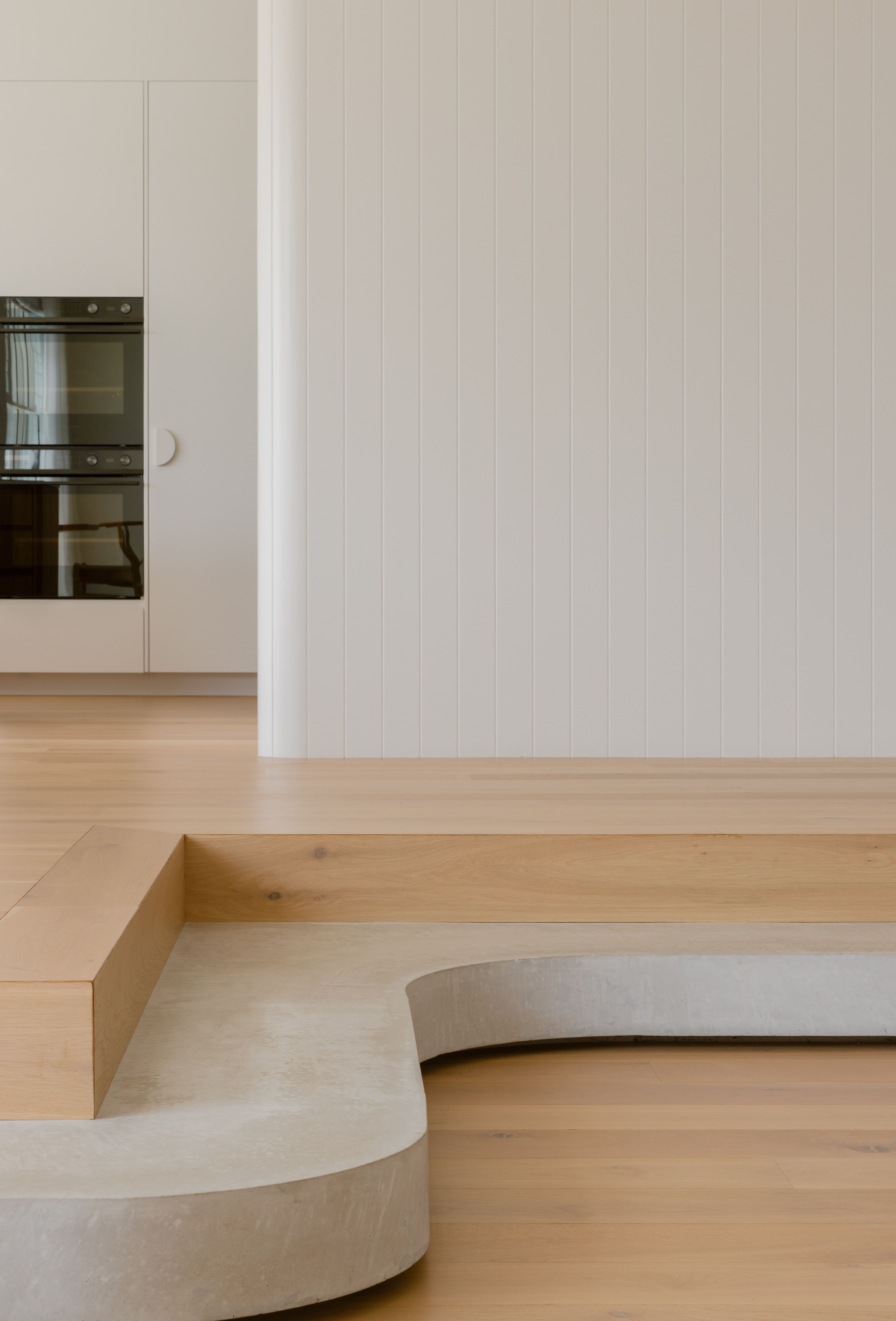 Designed intentionally for a young and energetic family, the role of the home needed to be one of recharge and reset. The fluid and open approach to planning internally overlays a flexibility for the years ahead, connecting between zones and pushing useability out into the surrounding garden. Grounded in an environmental and social conscientiousness; materials, systems, and detailing capture a sustainable spirit throughout. Wanting also to create their own unique legacy, each selection is underpinned by an enduring relevance and timelessness, capturing a connection to place over time. Bringing natural light inward and allowing it to dance internally throughout the day, River of Life is deeply connected within its natural setting. As a testament to sustainable living and the need for the notion of the home to be a place of refuge for the owners, the entirely new build occupies its site with both a restrained and intentional philosophy. Responding to both past and present, the form also acknowledges and embraces the natural elements at its disposal. Focussing on an overall light composition and feel, the sum of its parts create a calm place to both disengage and restore. The robustness of the base materials also offer a balance to the overall lightness, grounding the home. Across the site, contrasting lines and gestures come together. A curved entry void welcomes guests in an ushering motion, leading into a sunken living area where custom concrete steps soften the transition downward. Here, natural light pours in through strategically aligned openings that frame views out and bring the landscape into the interior. Together with other passive cooling mechanisms, the increased thermal mass of the concrete foundations assist in retaining heat, while also acting as a robust base for everyday family life. Opening outward, the immediate garden and entertaining spaces become an extension of the living room.