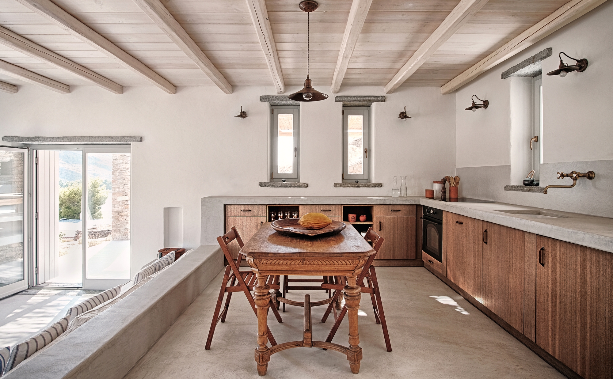Another take on the traditional and sustainable island architecture are the simple minimal furnishings, many of which are built into the whitewashed interior. The sofas doubling for storage space, the wraparound counter space in the kitchen; the beds even the benches and wood-topped table of the veranda outdoor's aim to provide a modest but comfortable living. Materials, such as the natural rope, floor-to-ceiling, "banister", the wooden kitchen, the pale grey painted wooden window frames and shutters which are contributing in the control of the heat and the ease of the breeze are elements that honor the local tradition but perfectly serve the modern needs.