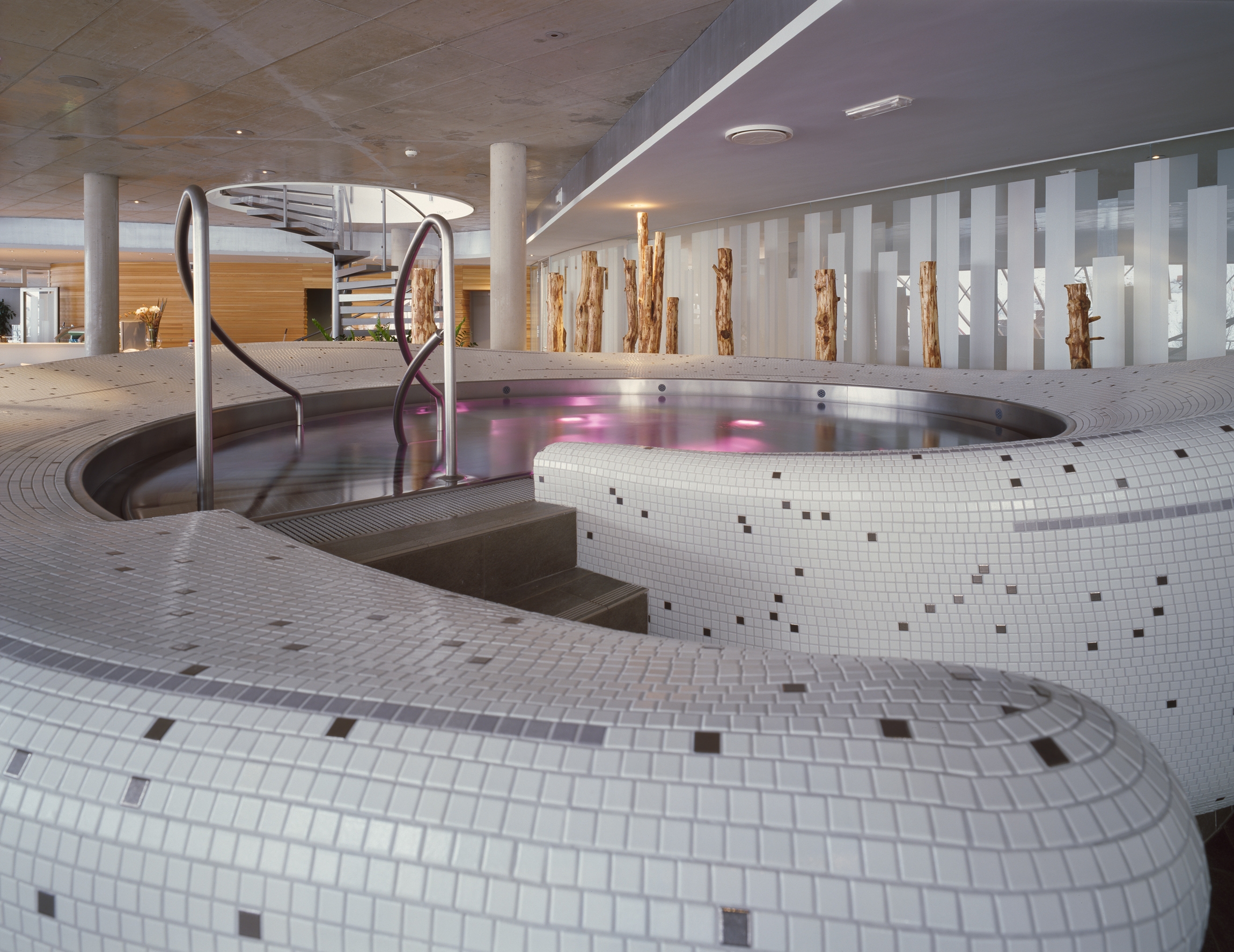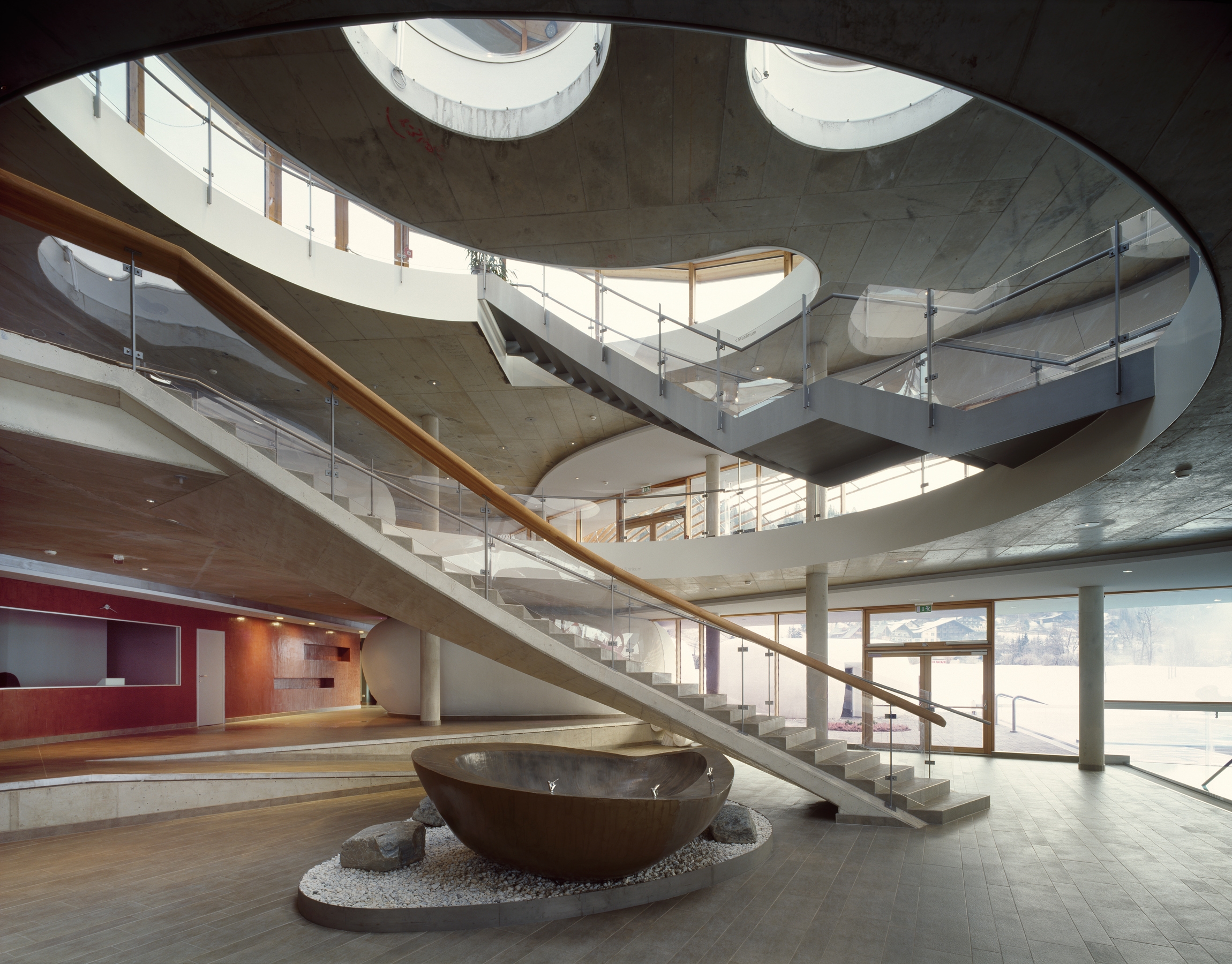 The various new amenities are characterised by different moods and atmospheres ranging from a cave-like meditation zone dug in an existing hill through to lightflooded spaces affording beautiful vistas of the surrounding mountains.