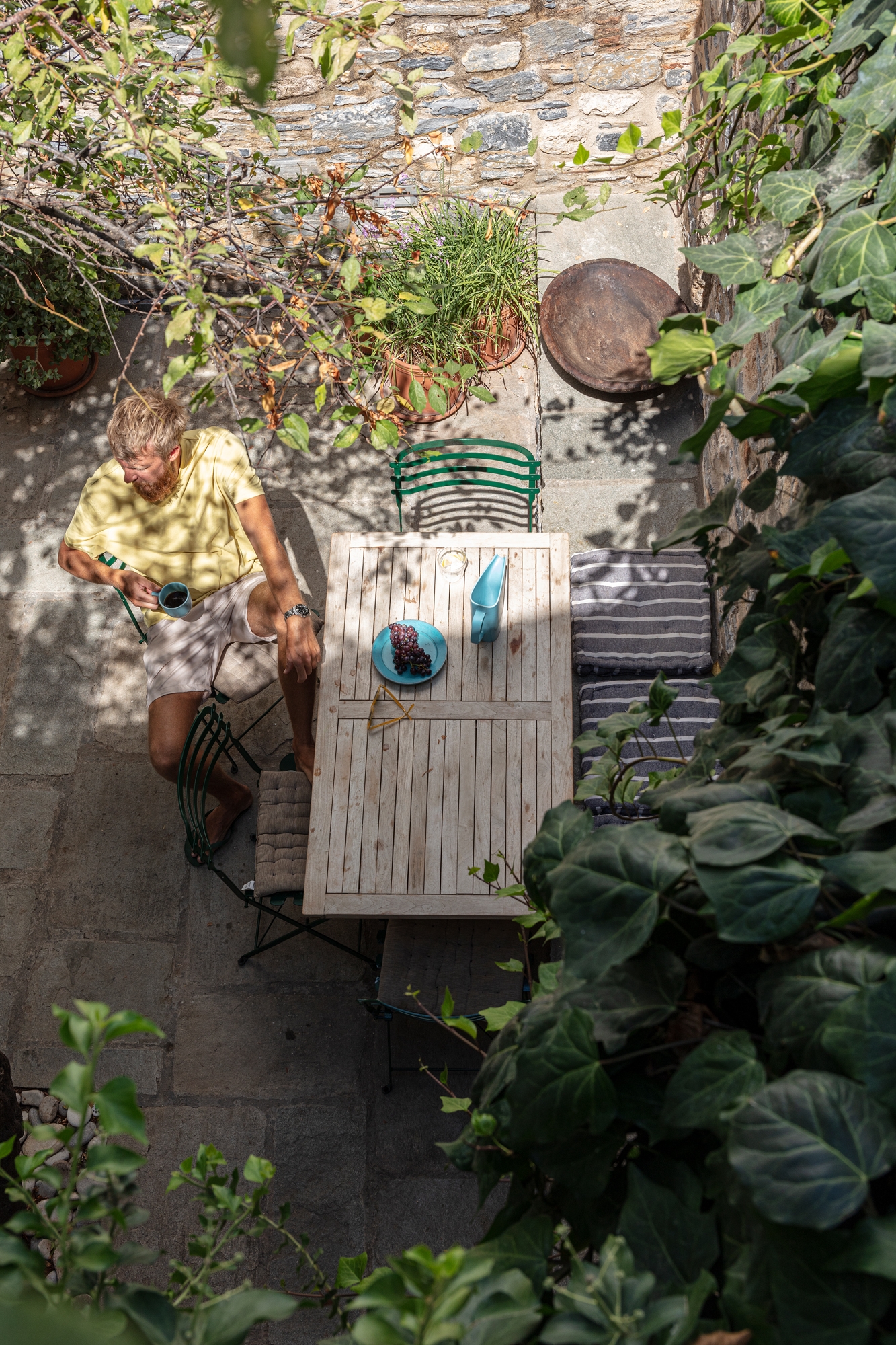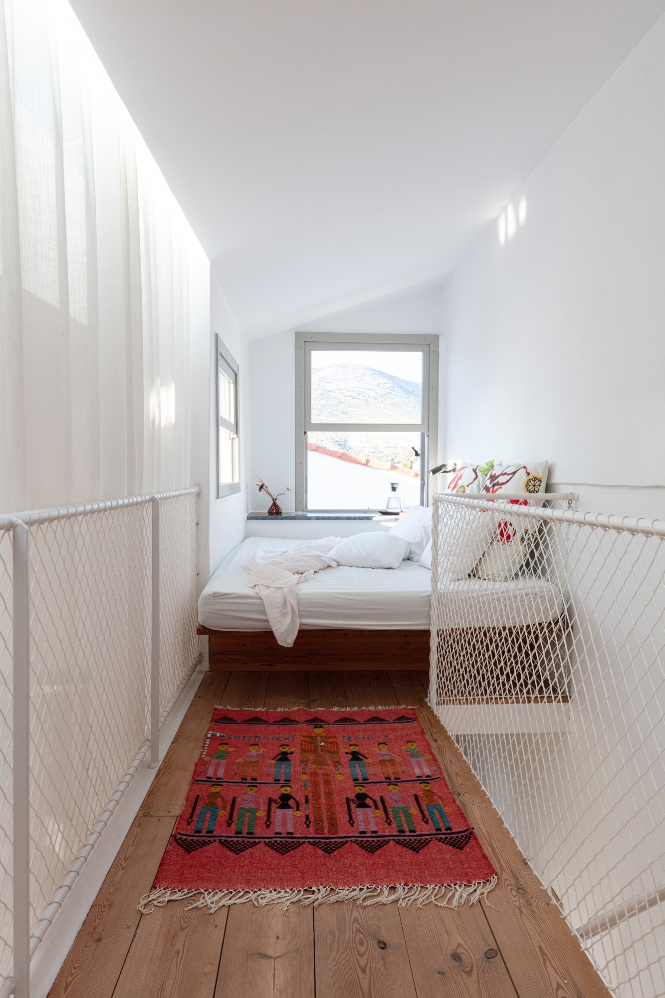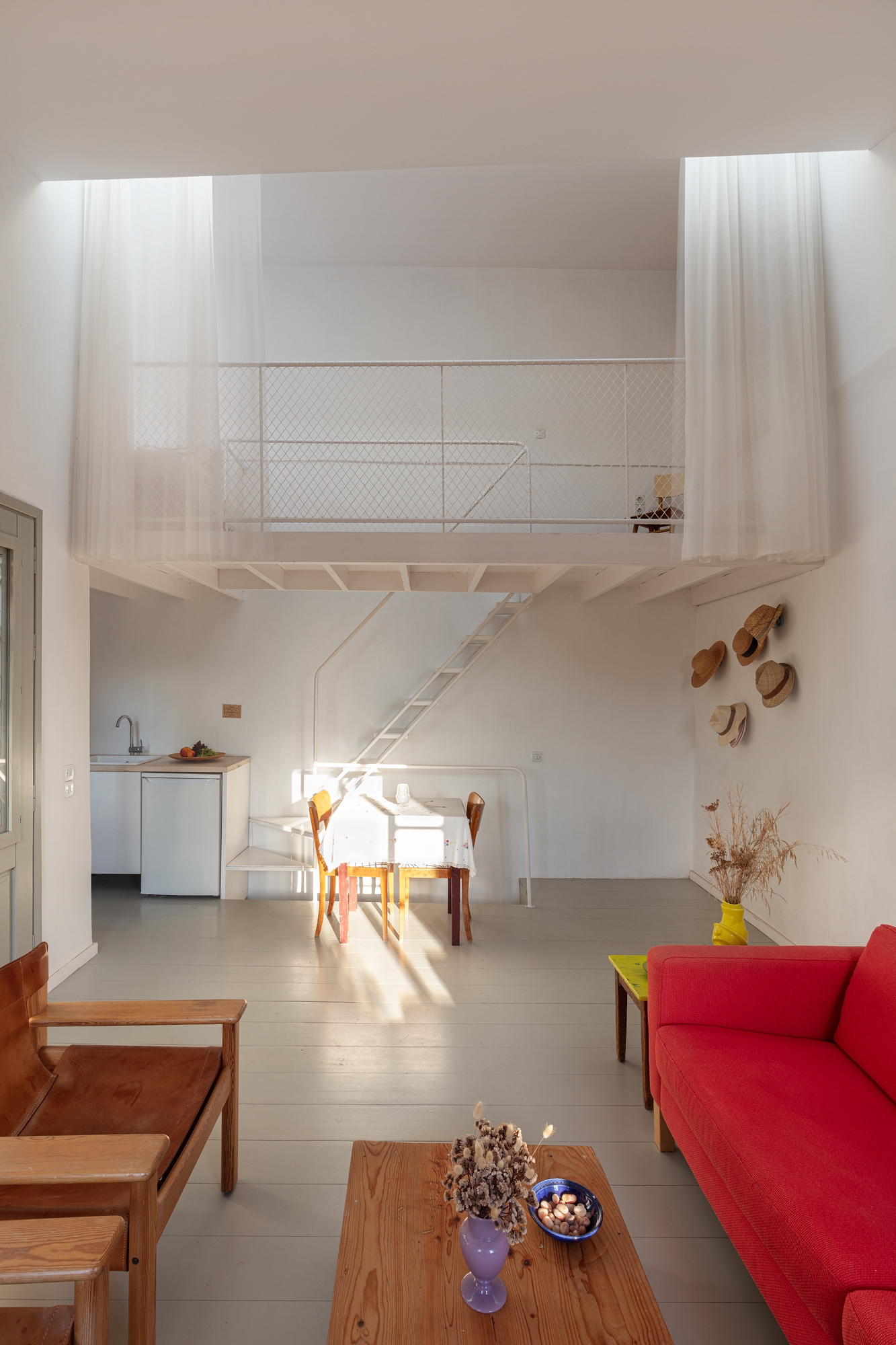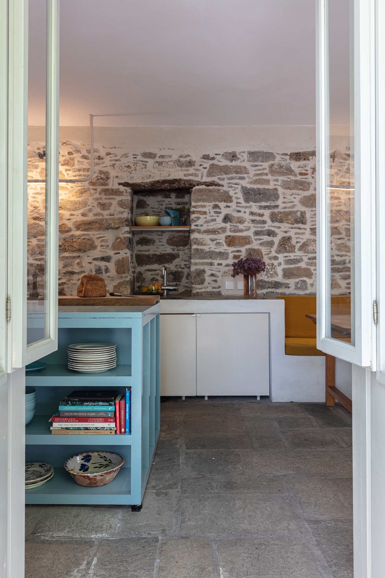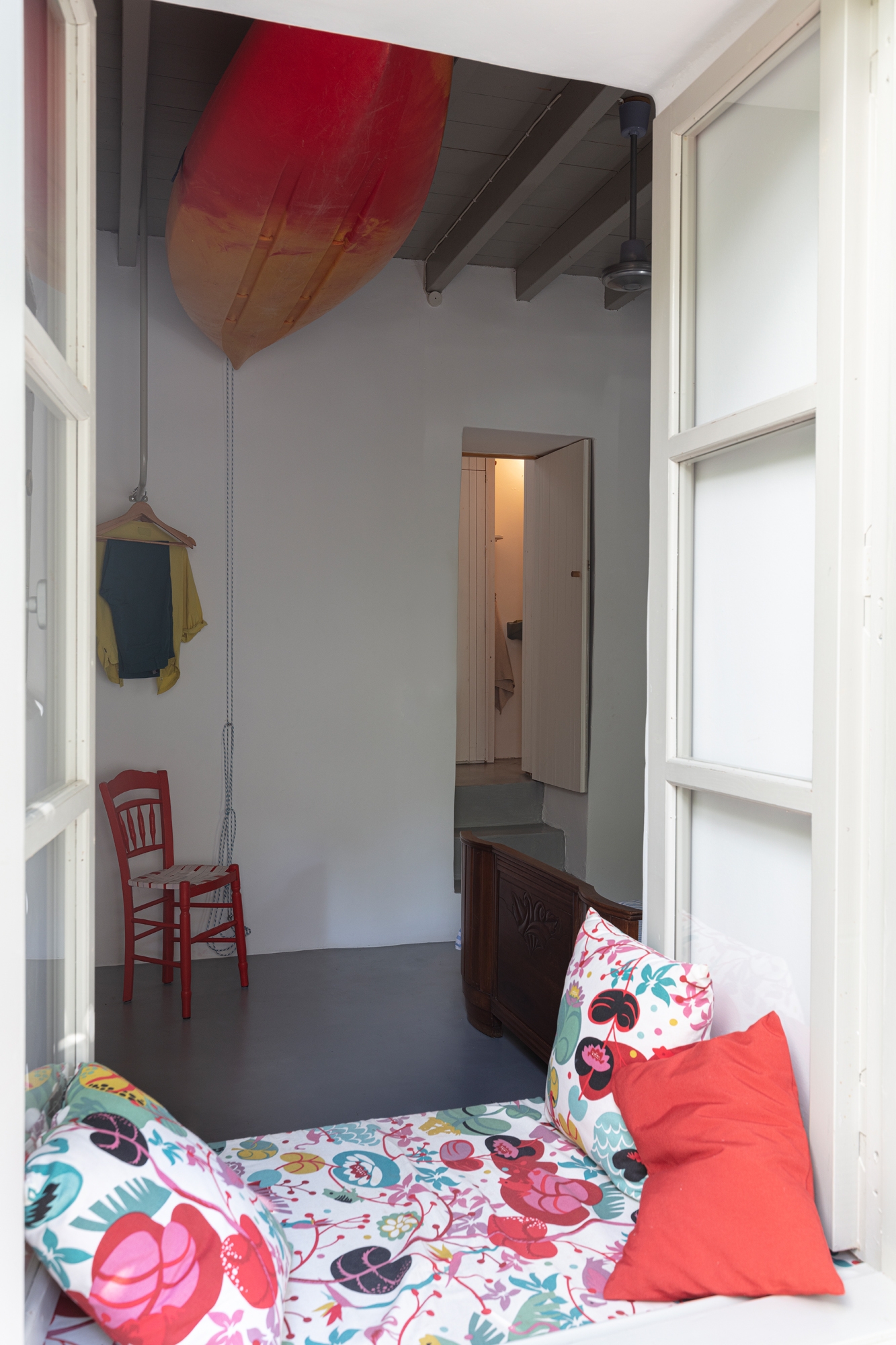 On the outside, the houses preserve the mandatory traditional character that is so typical of the architecture of the listed village, but the interior plays on a combination of the Greek in situ-built interiors in combination with the clean, fresh Scandinavian design style. Much of the furniture was built by Johan and Maria themselves. Two built-in bookshelves designed to accommodate the format of the typical Swedish paperback books that the family loves to read, a side table made out of a cutting board, and a custom lamp with a concrete foot are just some examples of the bespoke furniture that the couple have designed and made themselves. The bespoke homemade furniture has been combined and paired with design classics in all of the rooms to create to a contemporary and comfortable summer interior that feels both traditional and current at the same time. Every space has been utilized to the fullest, and many creative solutions have been employed to compensate for the size of the space: the family’s kayak hangs from the ceiling of one bedroom for example, and a shower has been installed on the main communication stairwell of one of the two houses.