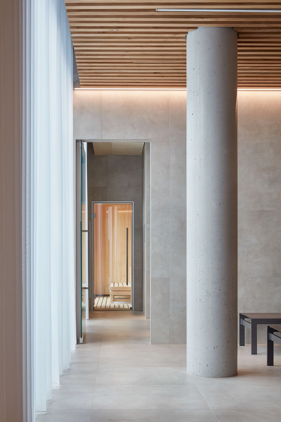 The design had to respect the existing column system of the building. The new layout thus tries to weave between the columns and create space for saunas, steam, and subsequent relaxation.