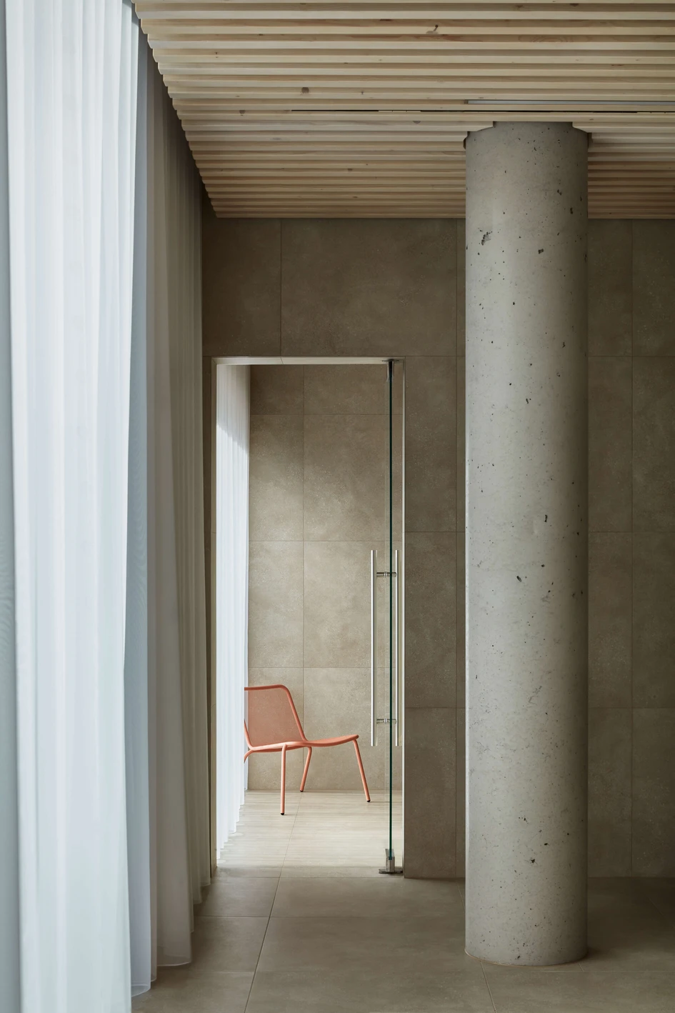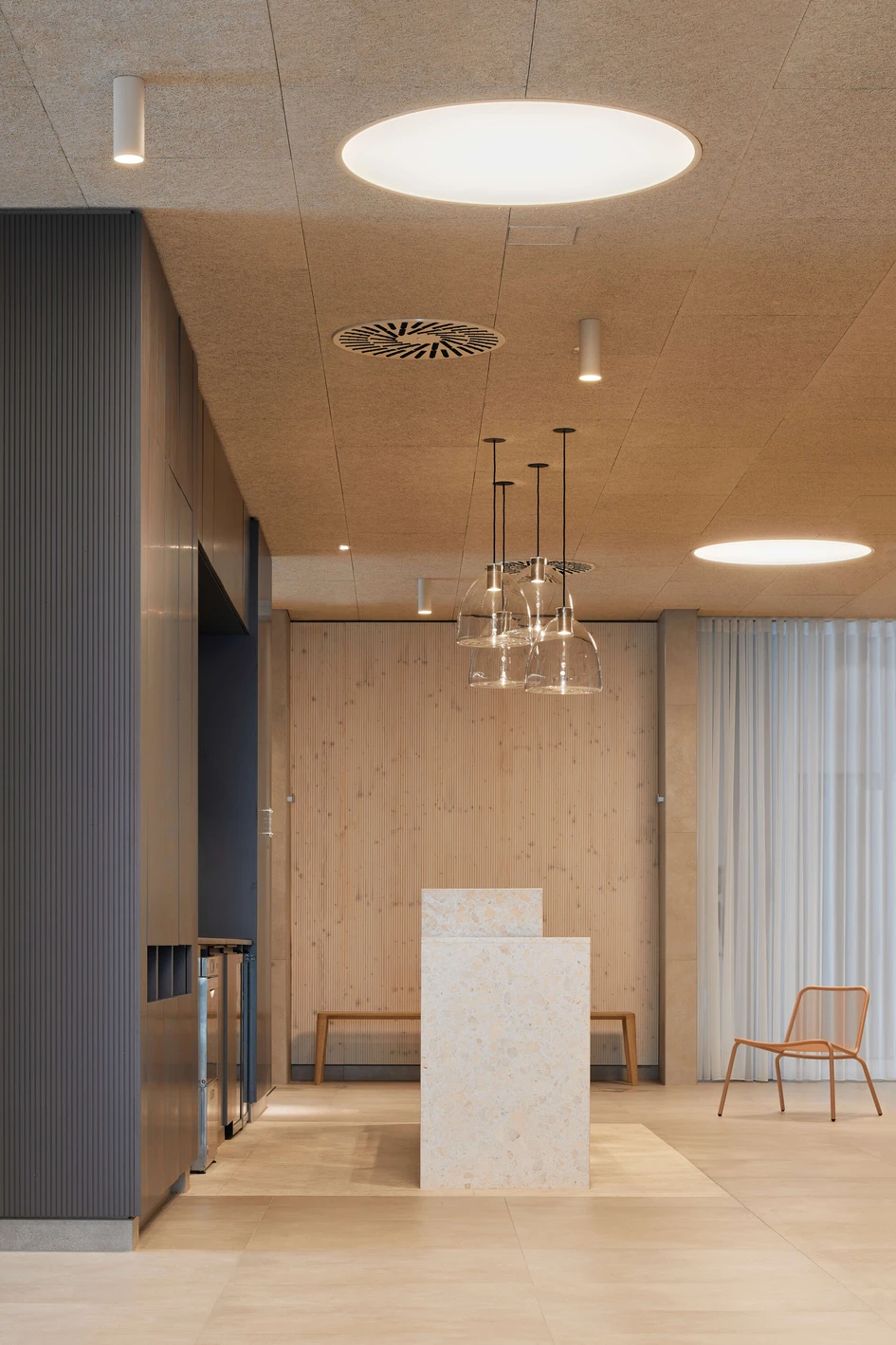 The lobby draws visitors into the bowels of the building at the intersection of various operations, including the building's connection to the existing spa. Through the changing rooms, the visitor reaches the first treatments in the form of steam and the Kneipp walkway. There are also several massage rooms on the ground floor with built-in woodwork made of spruce bio-wood. The second floor offers several types of saunas, steam, light-filled relaxation rooms overlooking the forest, and also a small private spa for rent. Heradesign ceilings in different colours and with different suspension systems run through the entire building, among other things providing acoustic comfort.