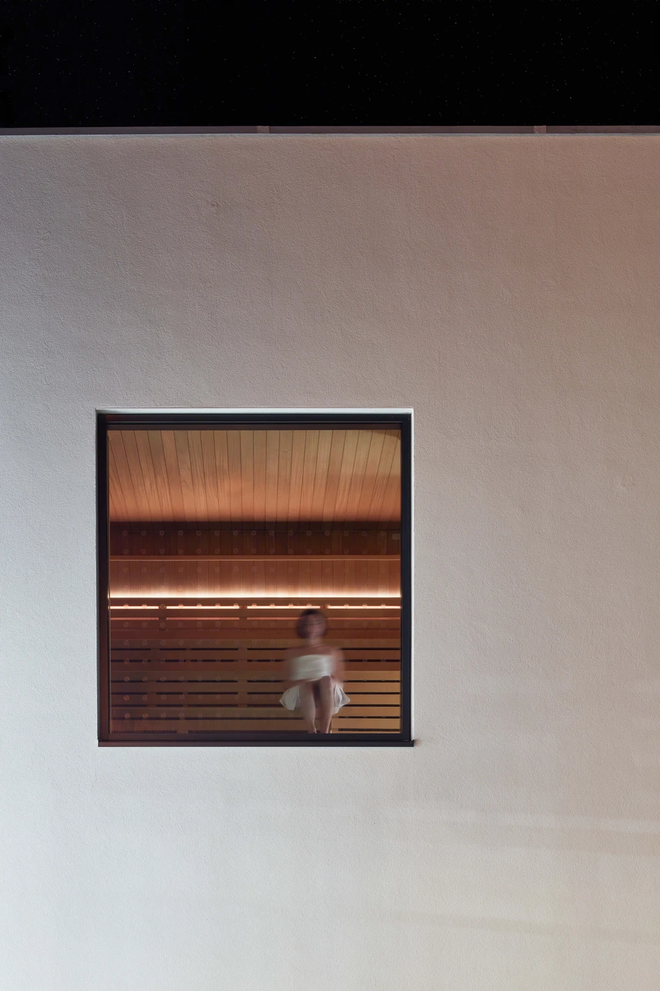 The lights are materially linked to the glass partitions and railings, contrasting with the wood and thin curtains to complete the interconnection between the natural saunas and the fragile history of the baths. The interior is complemented by original paintings, created specifically for the spa, which complete the overall atmosphere of tranquility and relaxation.