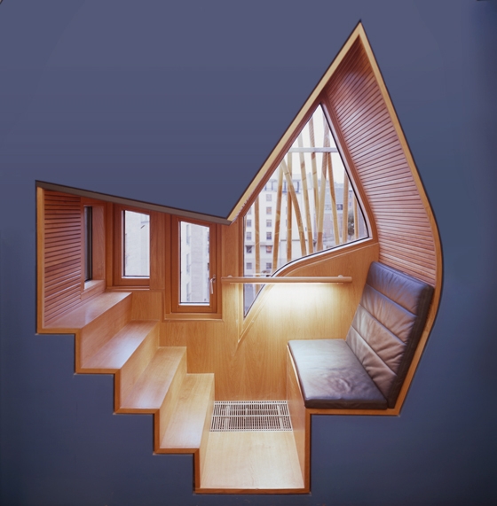 Scotland’s parliamentary debates are televised, so the Parliament’s meeting spaces needed to meet stringent lighting criteria for broadcasting. The Debating Chamber features large expanses of glazing for daylighting, a potentially disruptive light source. At the master-planning stage of the design, Sundin and Peiniger suggested rotating the debating chamber and positioning the adjacent leaf-shaped towers so that they would act as giant louvers in plan. Together, these buildings shield the chamber from direct sunlight during broadcast hours. Detailed 3D computer models and lighting calculations were then used to ‘virtually’ position and aim each individual luminaire within the asymmetrical, open ceiling.