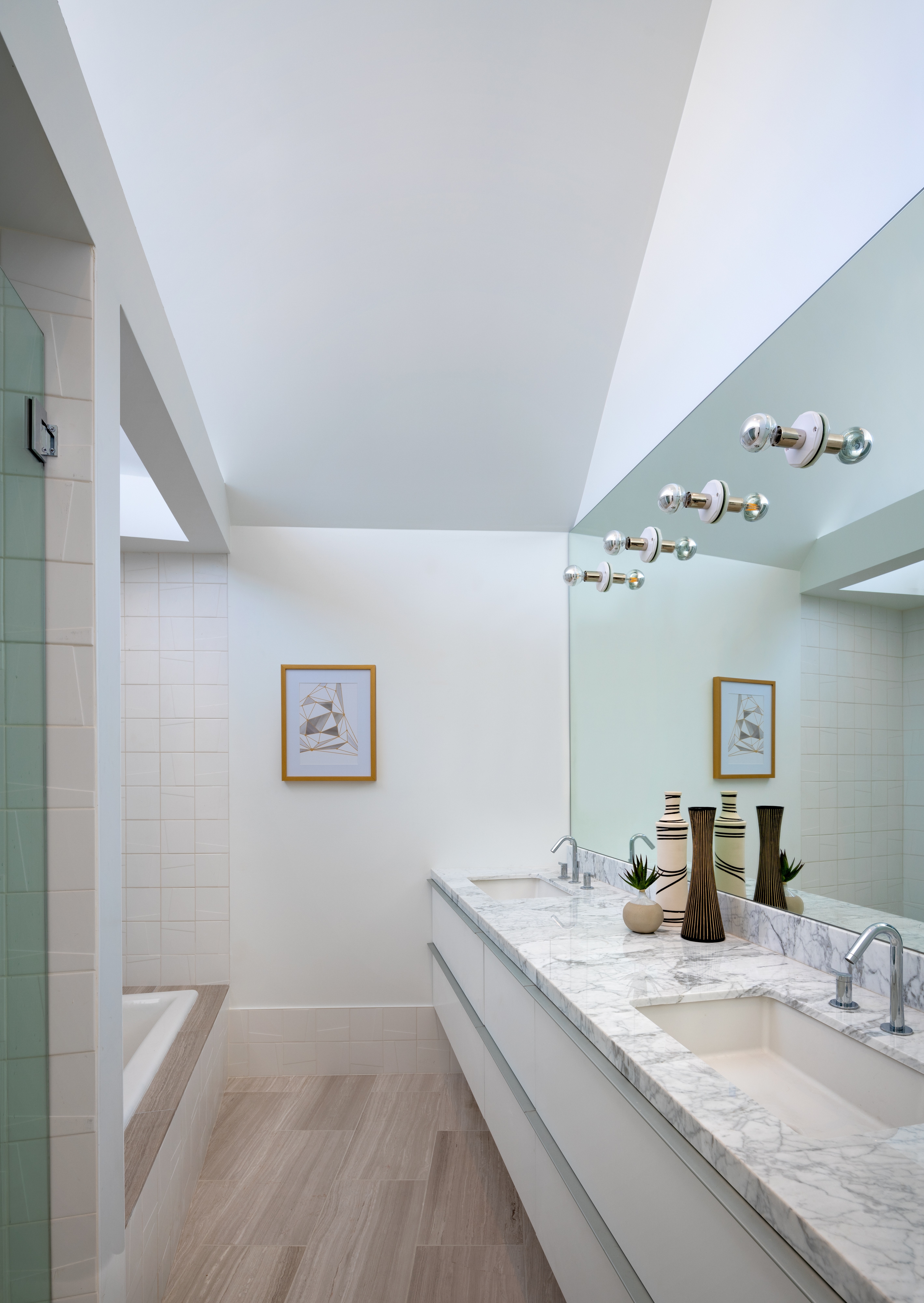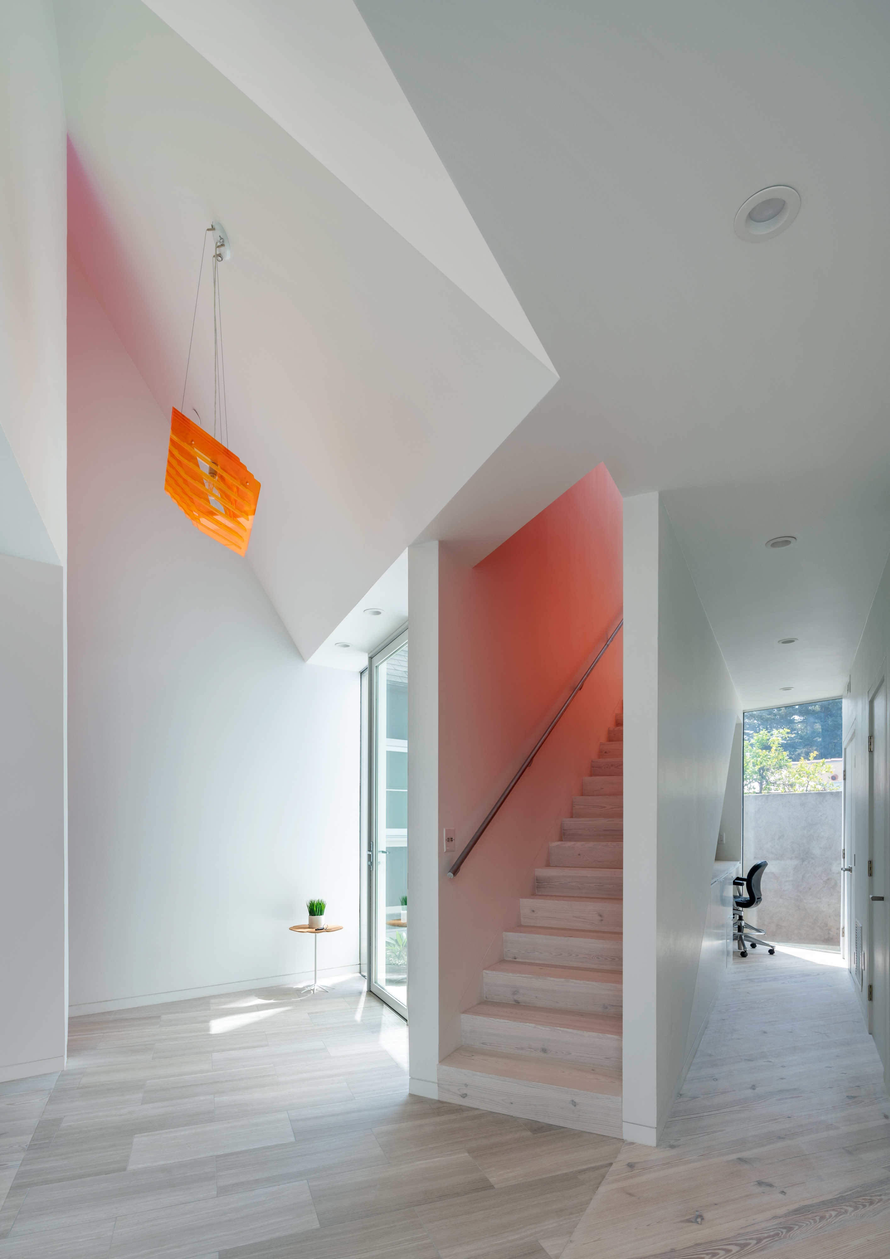 Floor materials such as tightveined grey limestone and white stained knotty pine suggest distinctions between interior and exterior. The interior stairs are painted bright red and orange, with the colors leaking into adjacent bedrooms and living spaces depending upon light intensity and time of day. Light cascades down into the interior from high windows, providing views to the sky and hills.