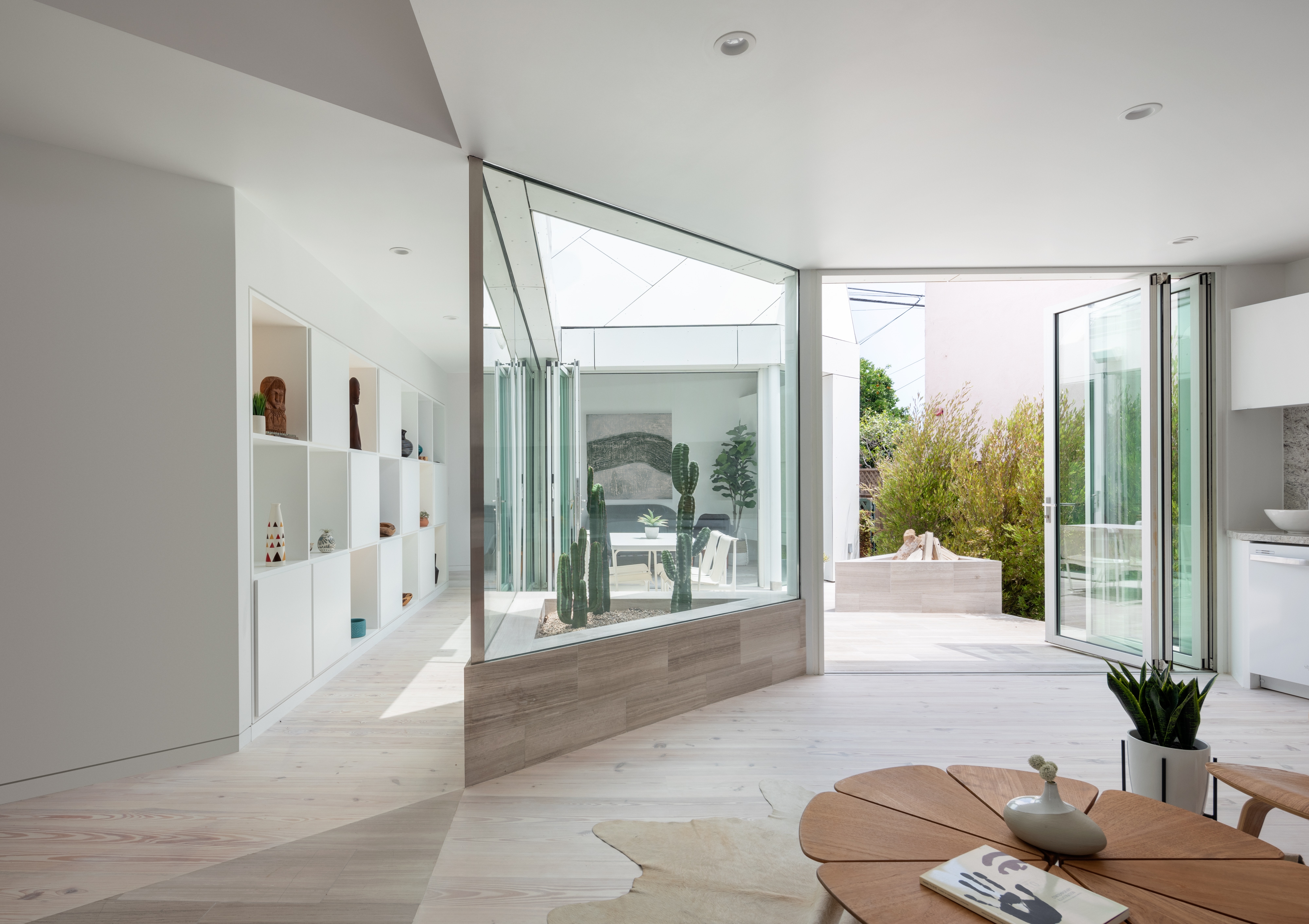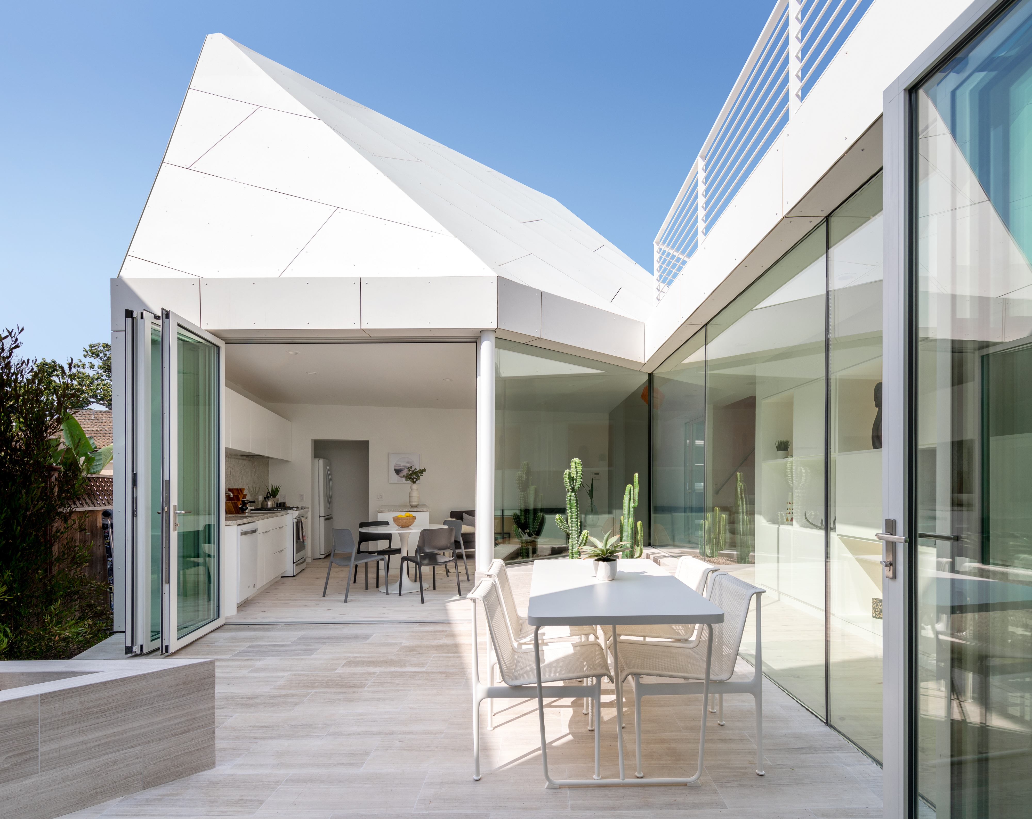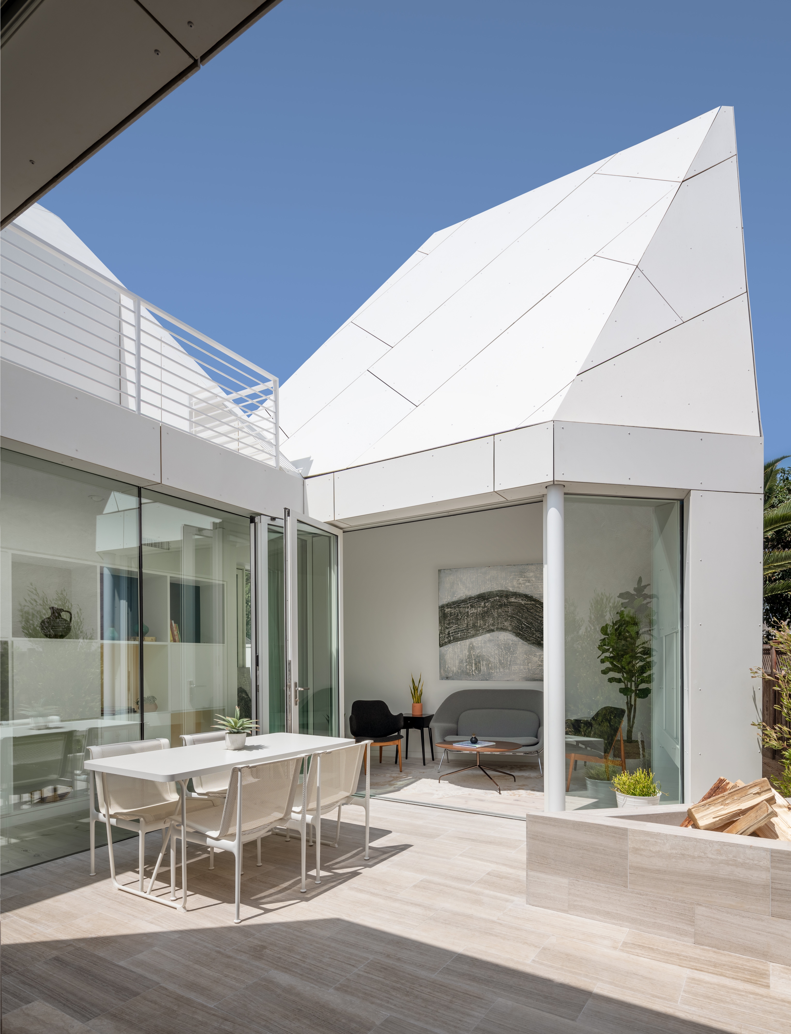 The new 1,500squarefoot home is an intricate aggregation of interior and exterior volumes. Each room is expressed through the massing and carves out a corresponding exterior space, creating a continuous flow between indoors and outdoors.