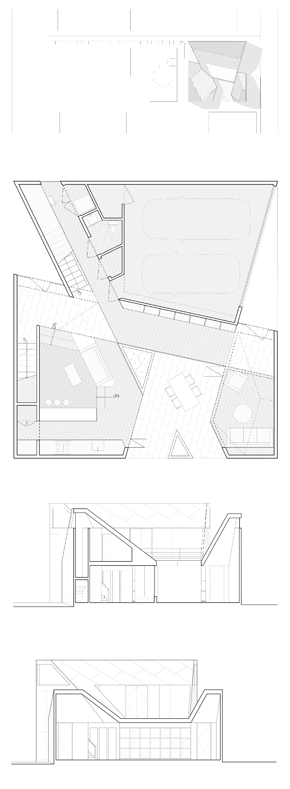 The exterior is clad with custompatterned cement board panels and can be read as a monolithic mass. The orthogonal surfaces have a slightly darker tone than those at a diagonal, producing an ambiguous reading between a single rectangular block and three aligned wedges. In contrast to the differentiatedbutopen ground floor, the master bedroom and guest room at the second level are isolated volumes, each contained in a separate wedge.