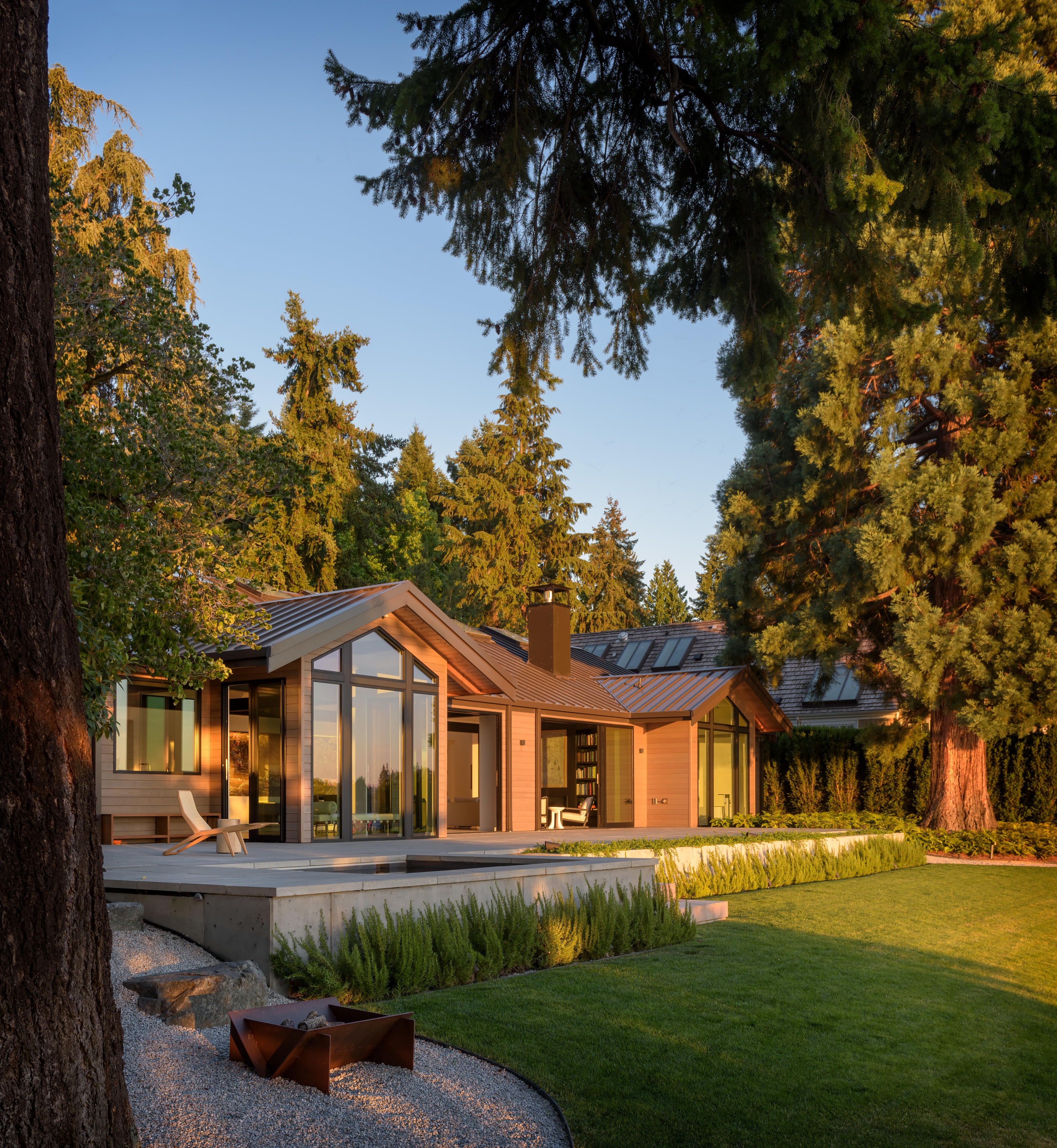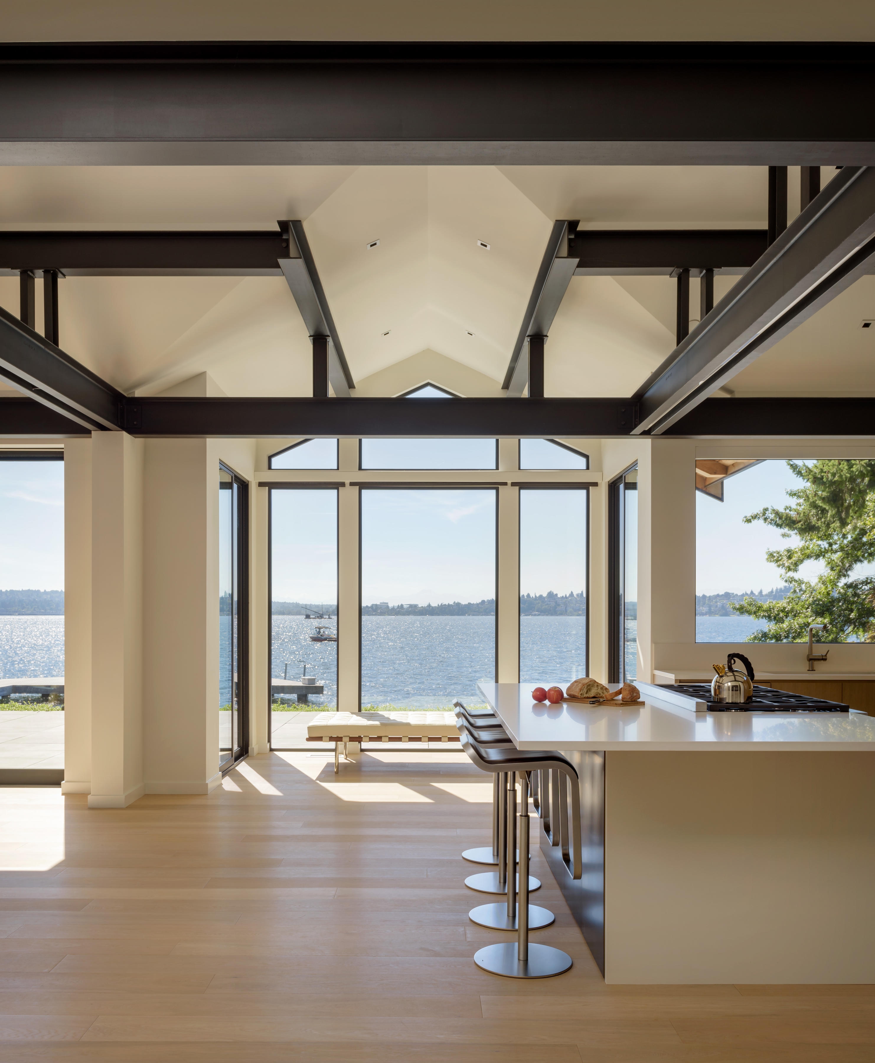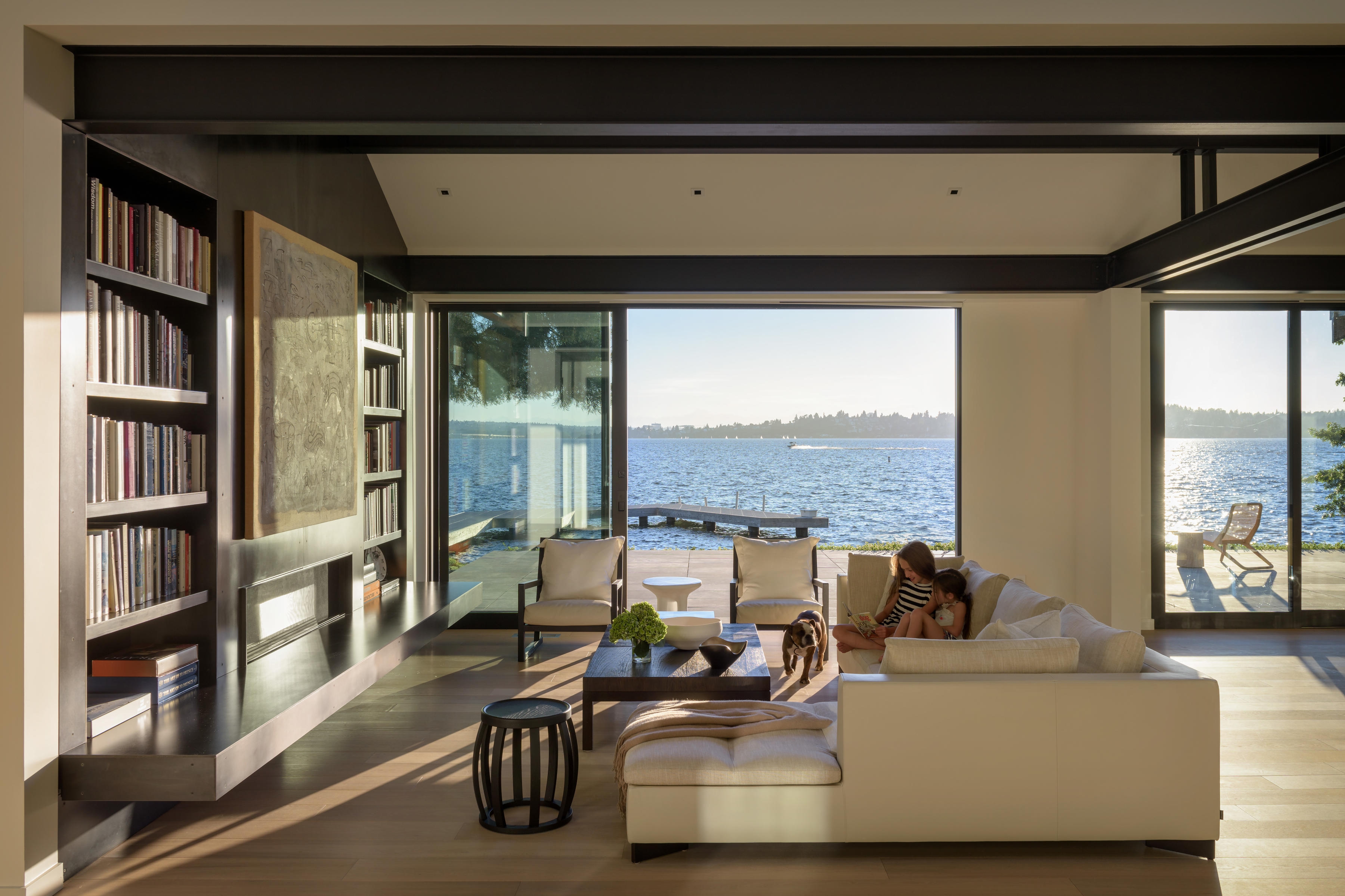 The building’s former rustic "lodge style" exterior was updated to a refined language of taut wood planes and a crisp metal roof and windows. Adding large operable doors and window walls helped optimize natural light and provide views to nearby Lake Washington. Extensive site improvements including native gardens, terraces and beachfront features provide new places for indoor/outdoor living.