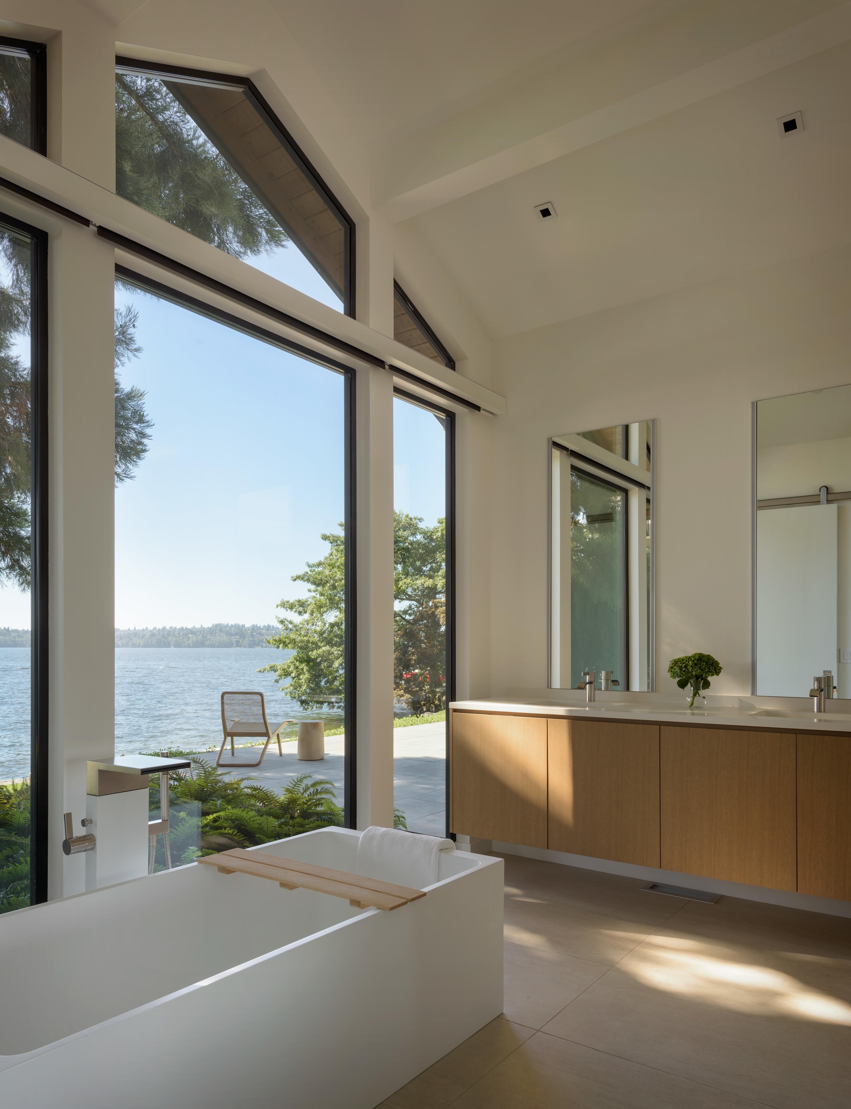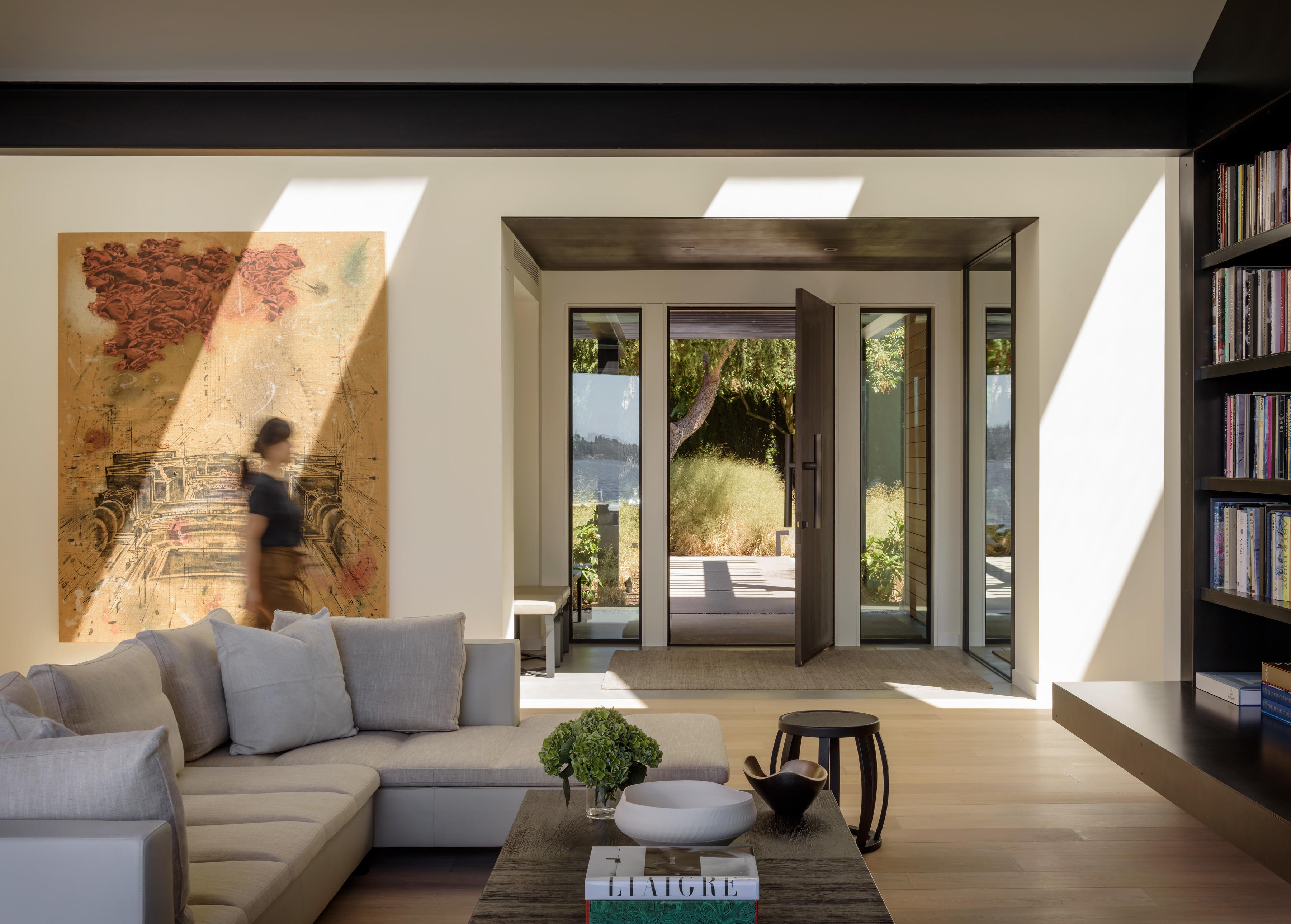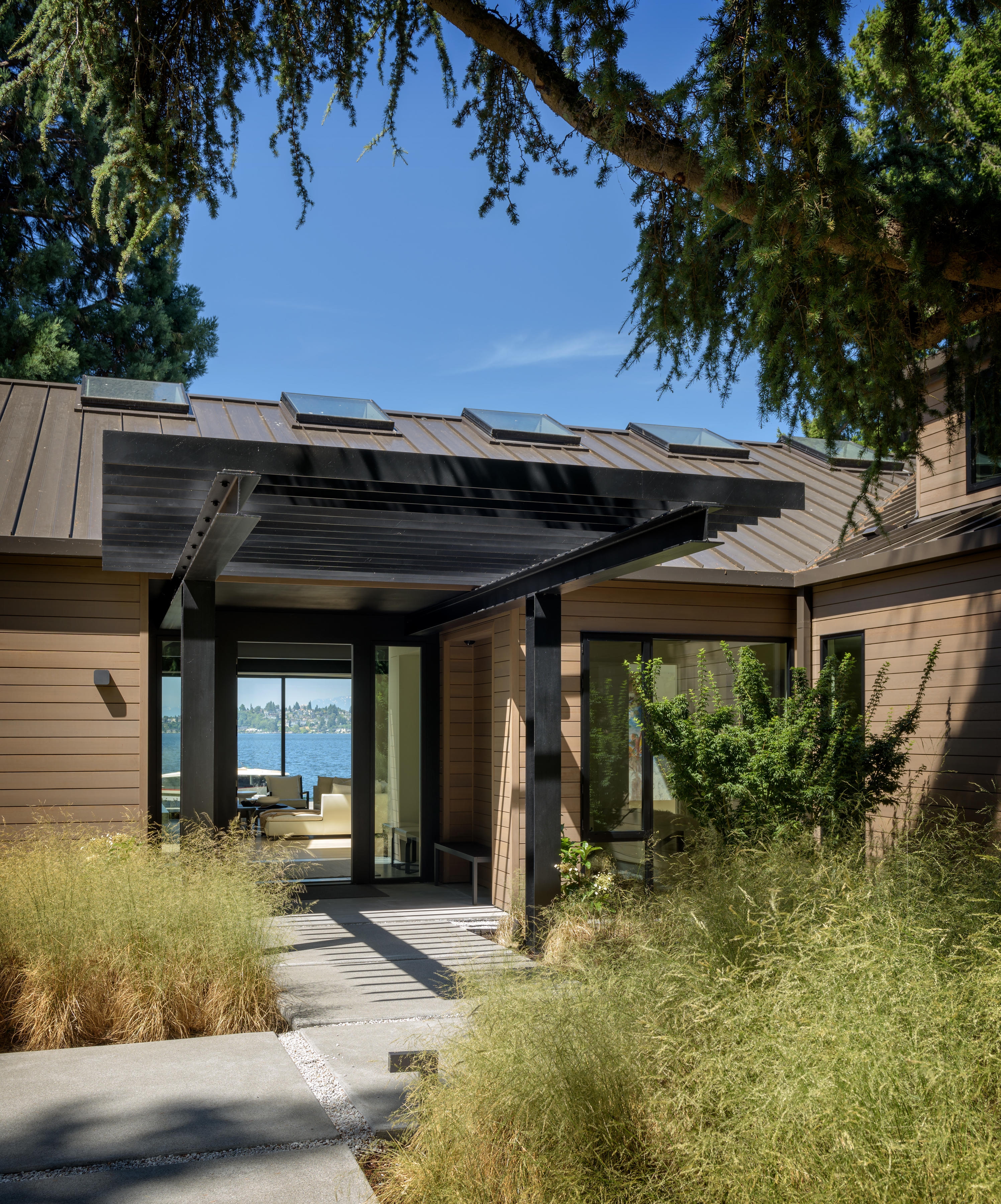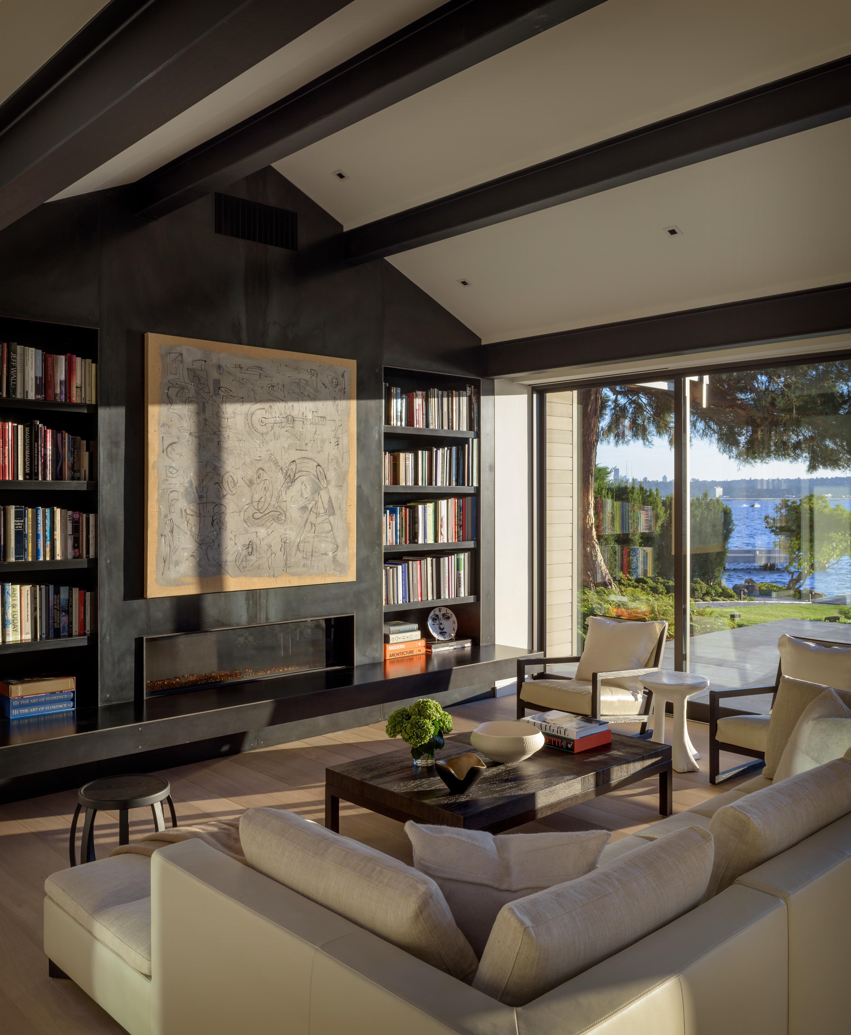The building’s former rustic "lodge style" exterior was updated to a refined language of taut wood planes and a crisp metal roof and windows. Adding large operable doors and window walls helped optimize natural light and provide views to nearby Lake Washington. Extensive site improvements including native gardens, terraces and beachfront features provide new places for indoor/outdoor living.