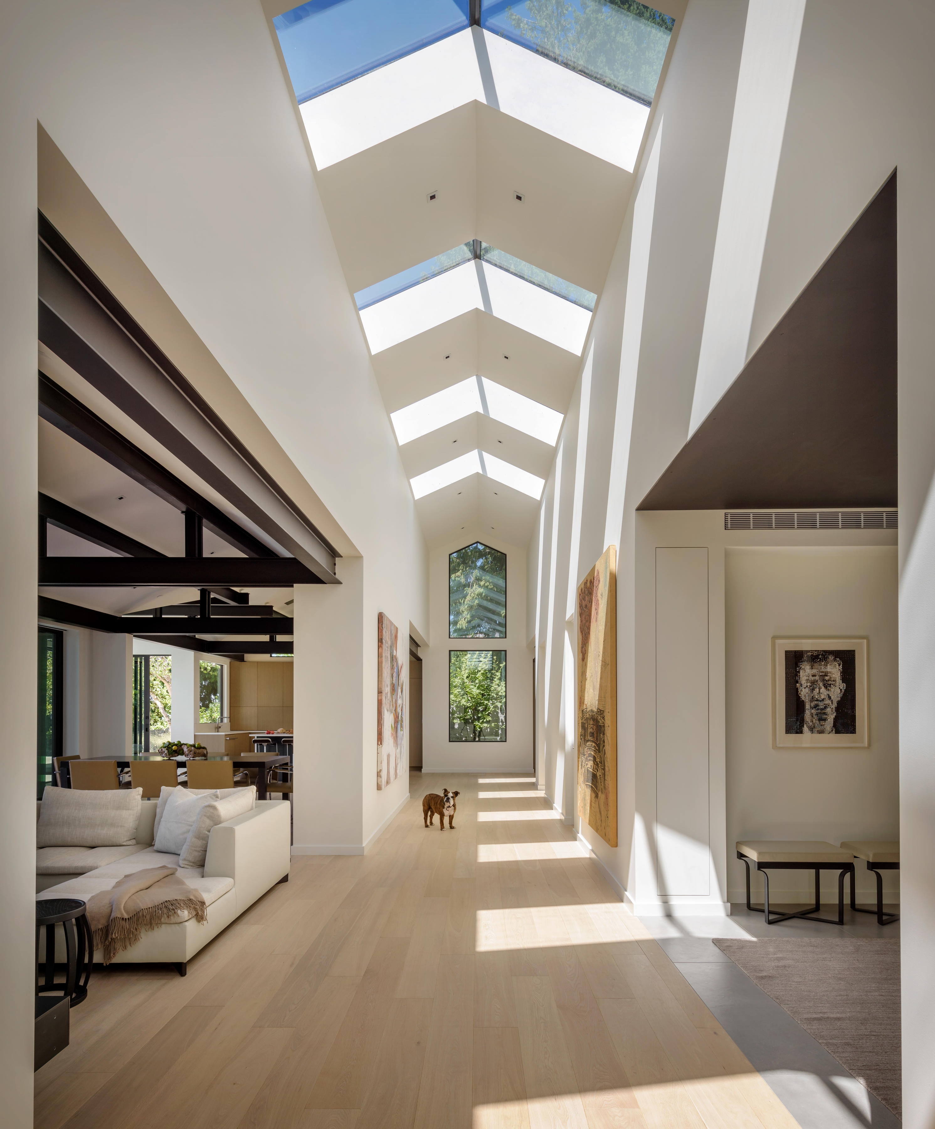 Inside, the home is organized around a central gallery spine with skylights that draw abundant natural light into the core of the house and surrounding rooms. Heavily articulated log and timber columns and beams were removed and replaced with a thin steel framework, opening up the space both physically and visually. An interior reconfiguration and a strategic above-garage addition provide new children’s bedrooms, a study and guest rooms, better supporting the young family’s lifestyle.