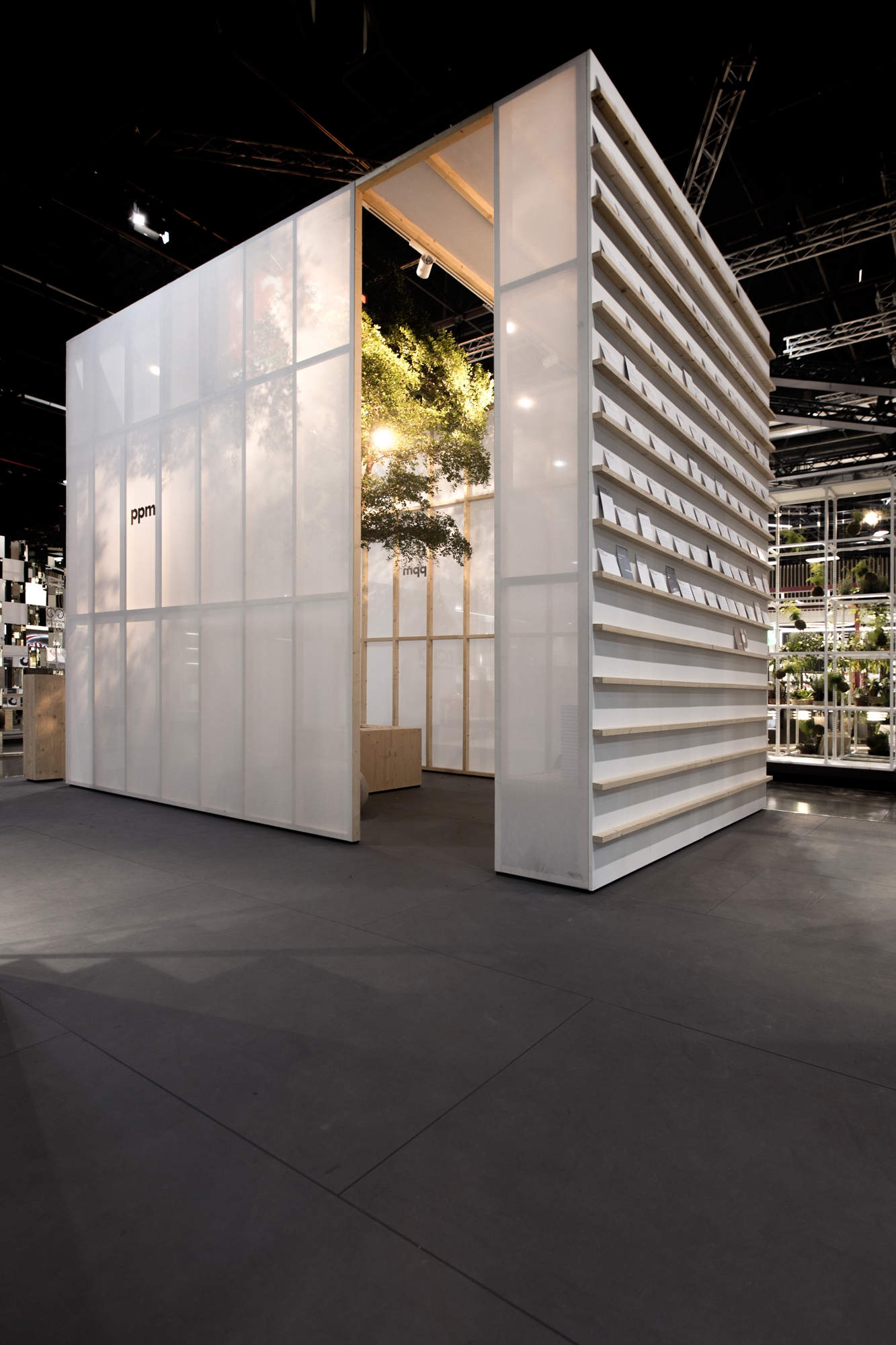 A place of encounter was created for the euroshop - ppm went to the trade fair to ask questions instead of presenting itself. The trade fair stand became a meeting place. The images behind it were the market place and the tea room. A quiet, unagitated, atmospheric place in the middle of the trade fair. An oasis for rest, exchange, inspiration. A temporary architecture built from minimal elements, a serial construction covered with fine fabric, translucent, suggestive. A tree as the centre of the square, a cosy atmosphere. The room formulates a request to bow at the entrance, you meet everyone in this room at eye level, you meet people.