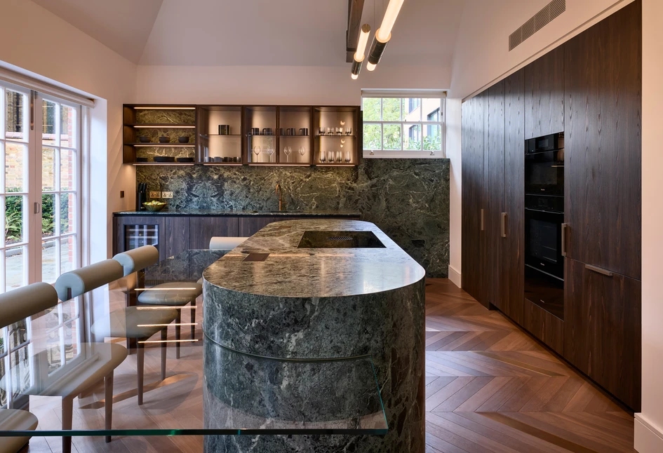 The kitchen, created in collaboration with Poggenpohl and Golden Mean Design, combines a green marble called Verde St Denis, with Poggenpohl Smoked Ash doors, in a vertical grain, book matched to create this stunning, elevated appearance. The client wanted a modern contemporary kitchen with an art deco twist to be in keeping with the historic building. The brief was to transform the space into a unique kitchen with state-of-the-art appliances, incorporating the original features of the space, with its vaulted ceiling and timber beam. The client requested the kitchen to have an island as well as a dining and entertaining space with dramatic features which complements the apartment.