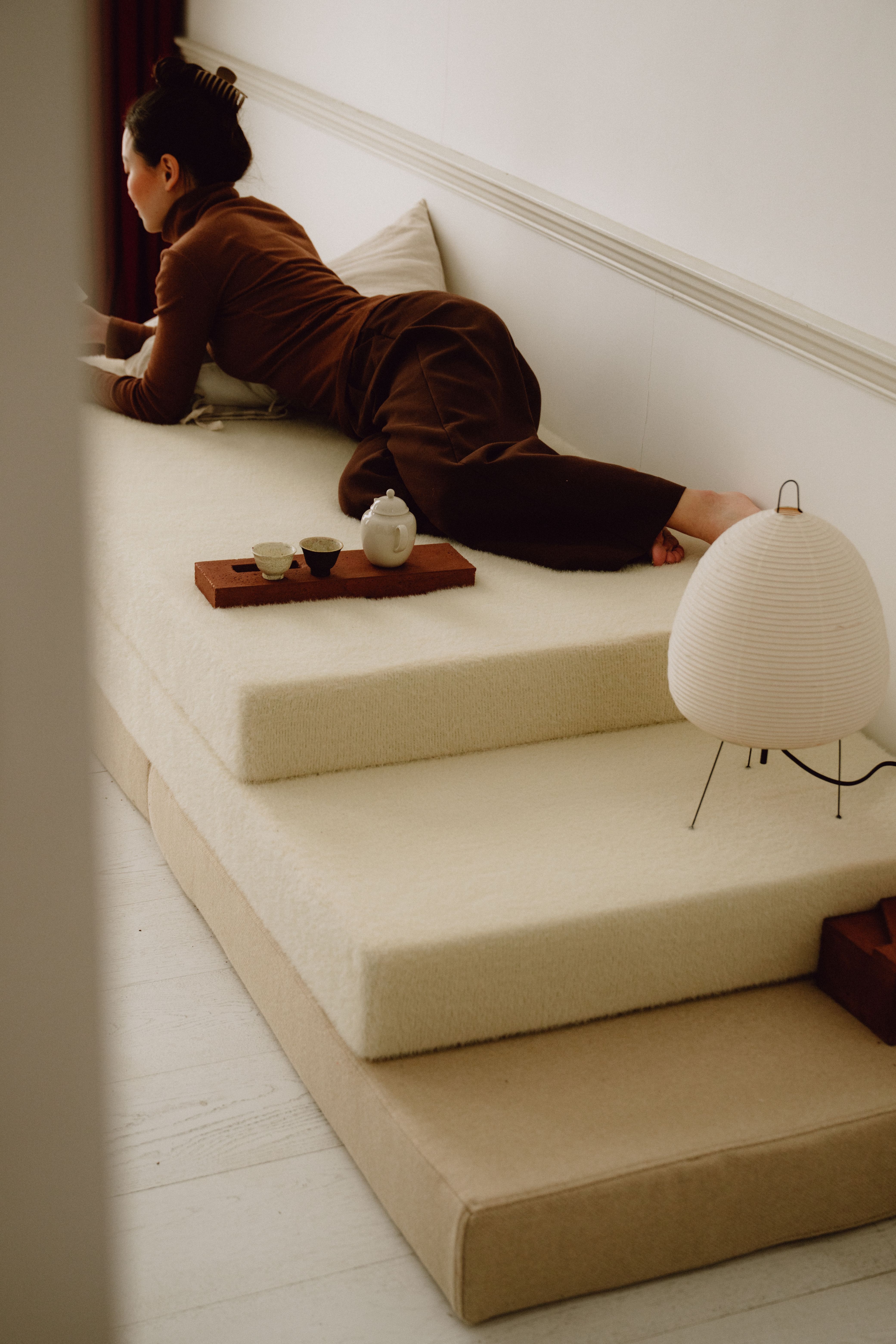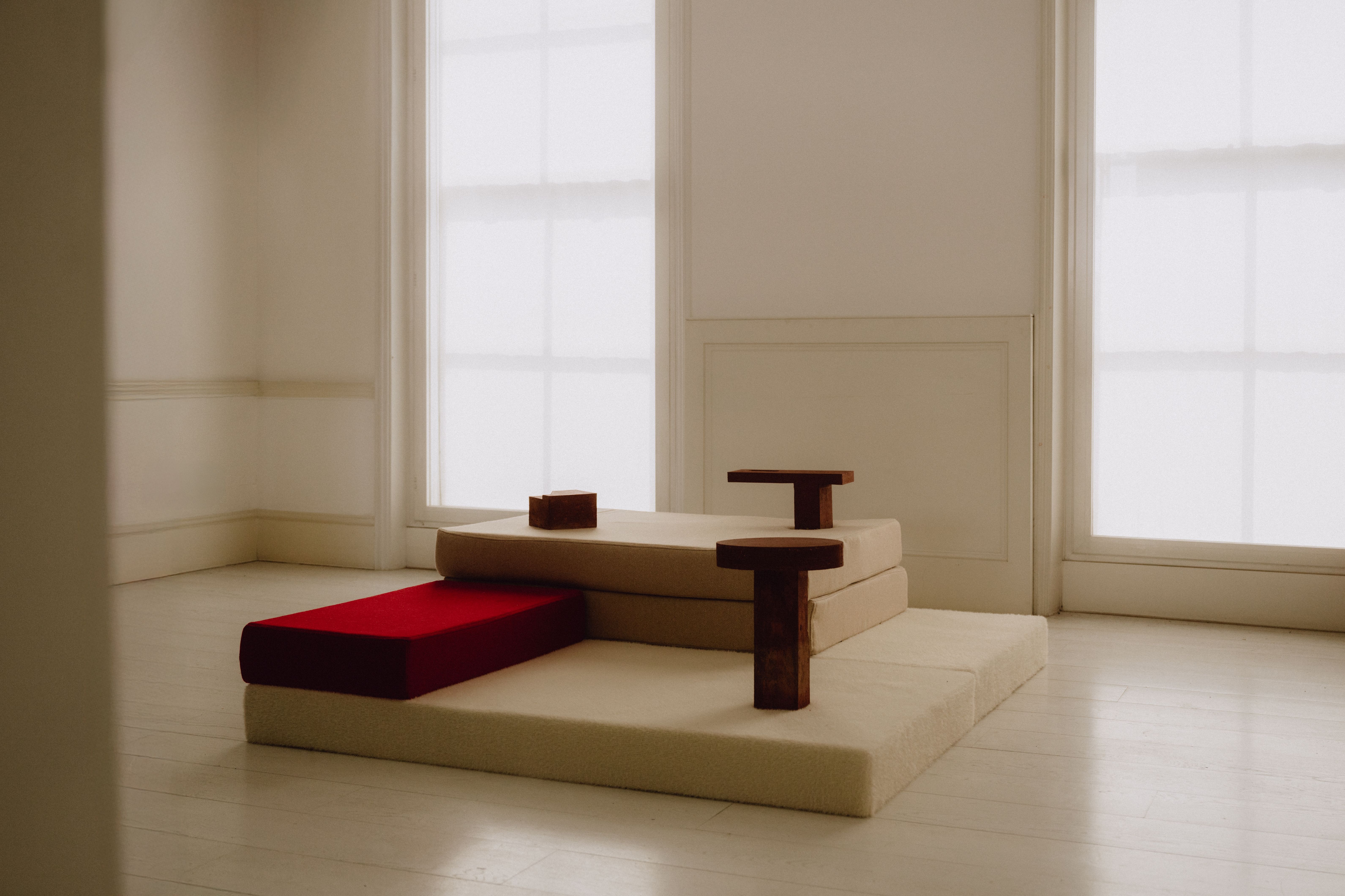 Soft Spot presents a social furniture in the form of cushioned steps embedded with earthen casts. The design offers a soft, adaptable canvas where users can rest, hug, gather, and explore their own ways of inhabitation to fulfil various social needs. This interactive experience is complemented by the earthen casts which serve as playful, versatile objects–such as tables, plinths, and vases–welcoming personal customisation and connection.