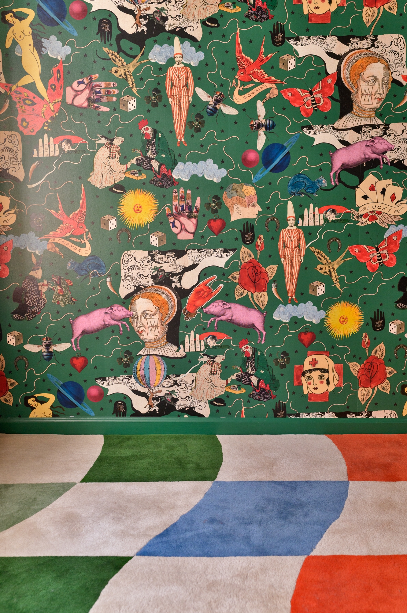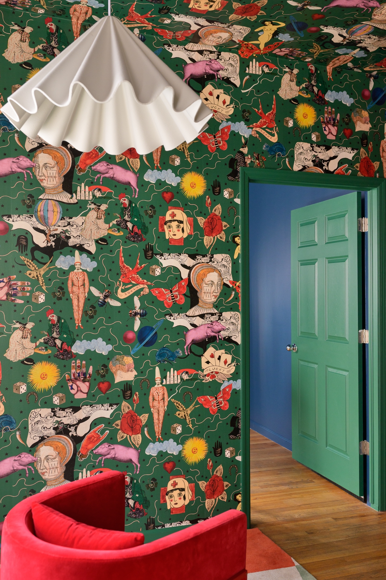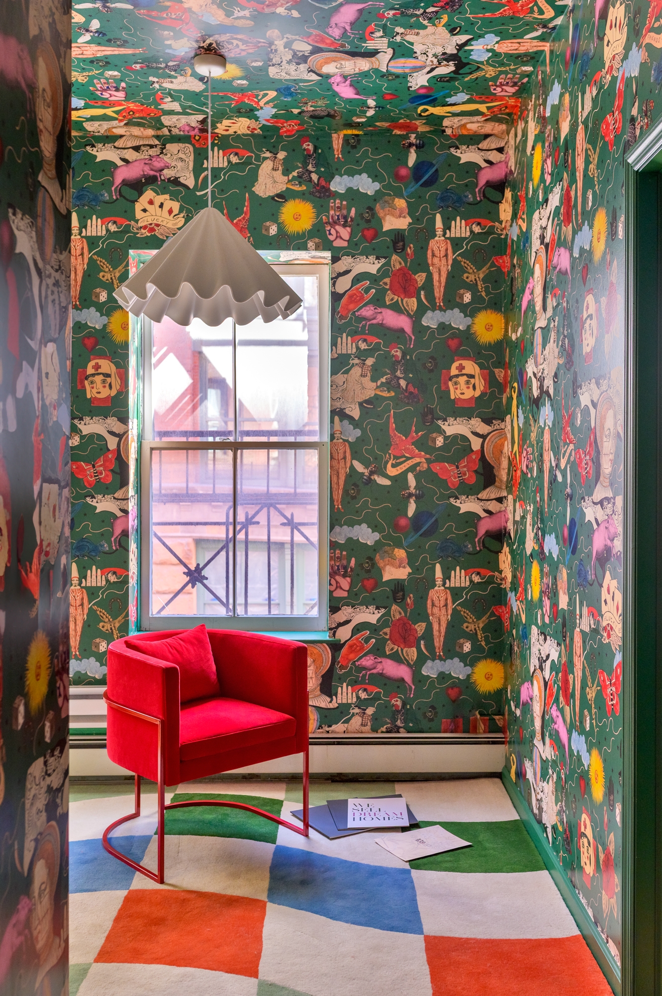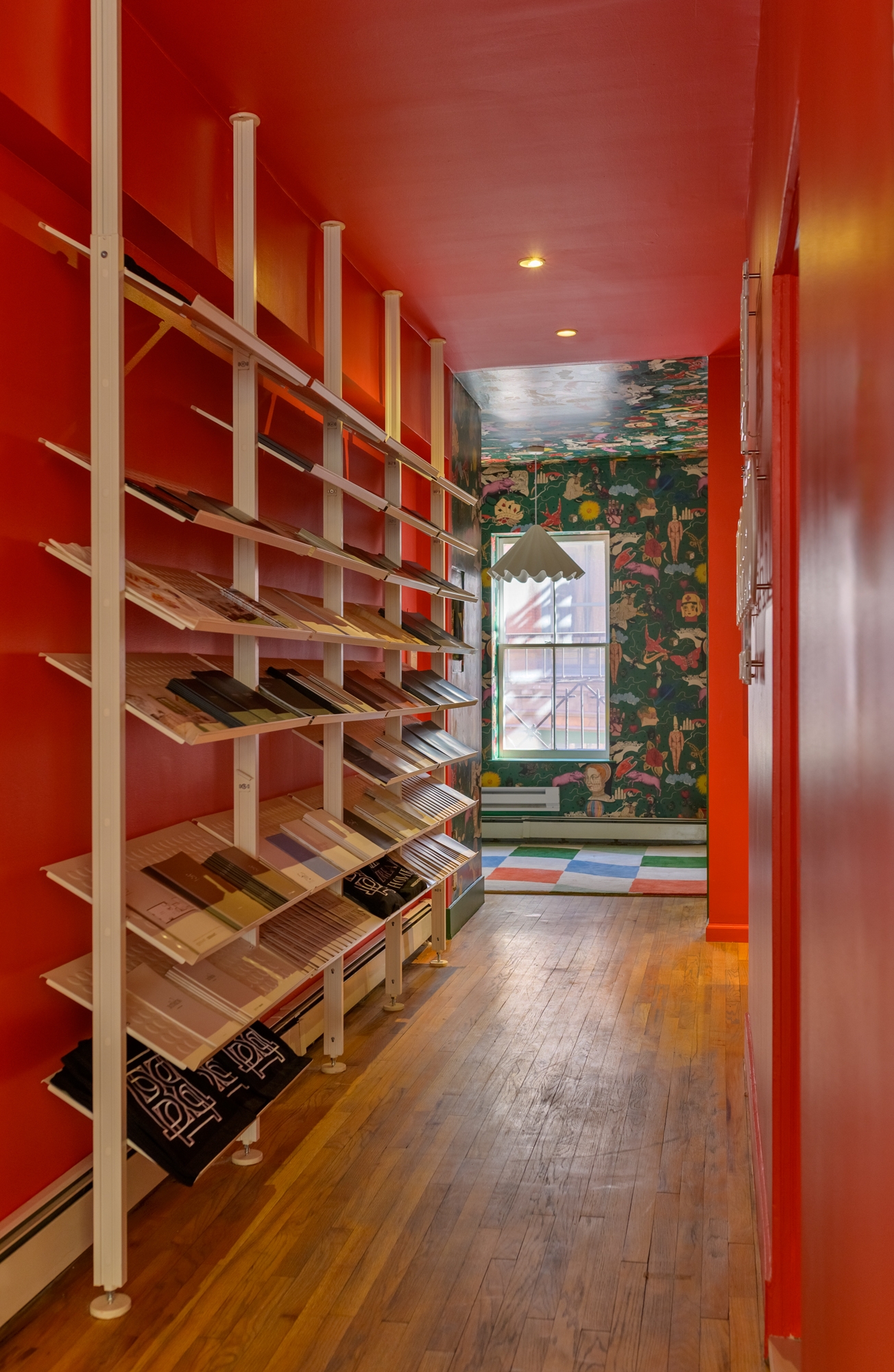 The design process began with the idea of furtive playfulness. At the core of the design is a selection of striking features that mirror the eccentricities of the office. White metal racks and a vibrant red wall create display space for custom brochures for each property. Raucous Alice in Wonderland-themed wallpaper was specifically chosen by the clients—an eye-catching, whimsical addition. To disorient, the abstracted form of a carpet was reproduced on the ceiling of the conference room.