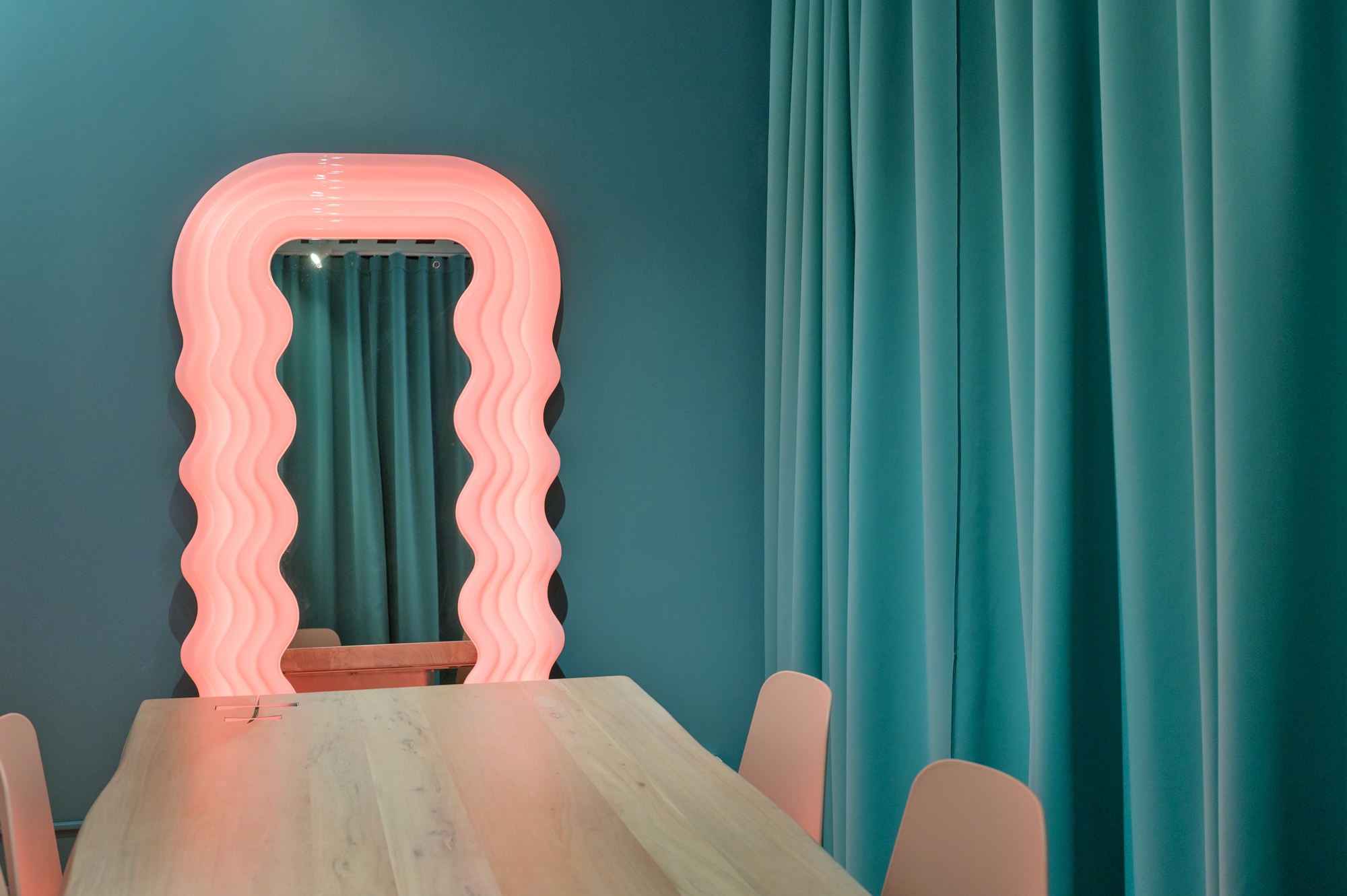 The program then responded to a hybridization, where multiple forms of production, coordination and communication were all designated specific places. The Meeting Room ceiling recalls a floor rug upside down, contributing to disorienting and questioning standard real estate practices. To add a touch of playfulness, the Uvafragola mirror by visionary designer Ettore Sottsass completes the space. Open offices are juxtaposed with private Zoom meeting nooks as well as a taller desk with card games to keep the office members far from