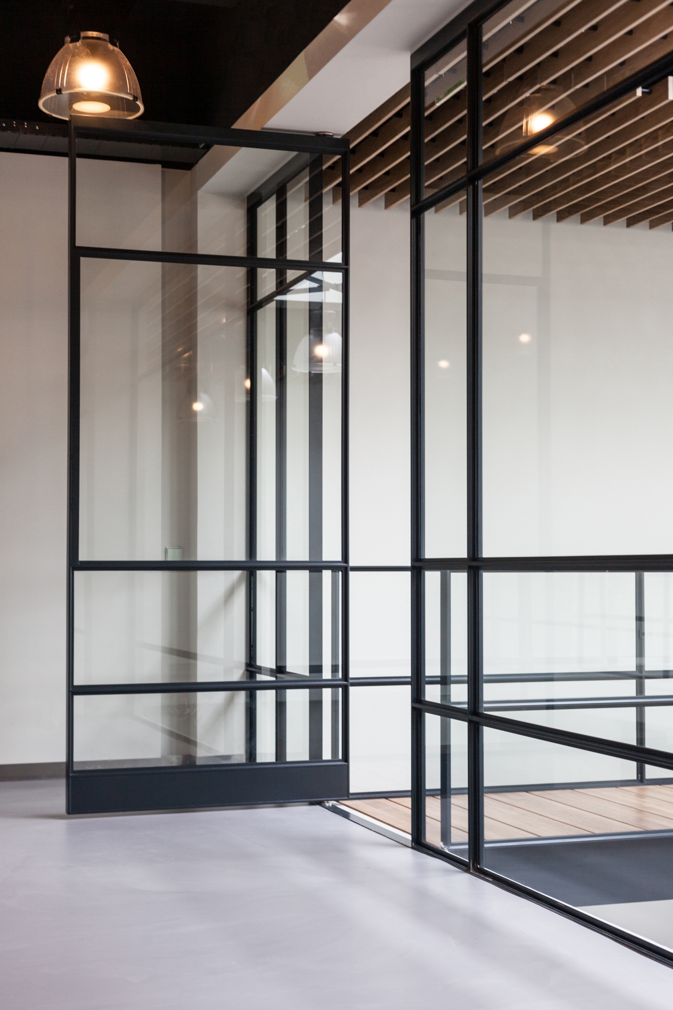 In the Somfy House in Hoofdddorp, those who are interested can experience the comfort of smart-home solutions themselves. In 2015, the storage space of this Somfy House was reconstructed into a beautiful showroom, equipped with an elegant steel-framed glass door. The space has an open and transparent character due to the abundant use of steel-framed glass. The design of the pivot doors continues into the stair gates, creating a stylish unity.