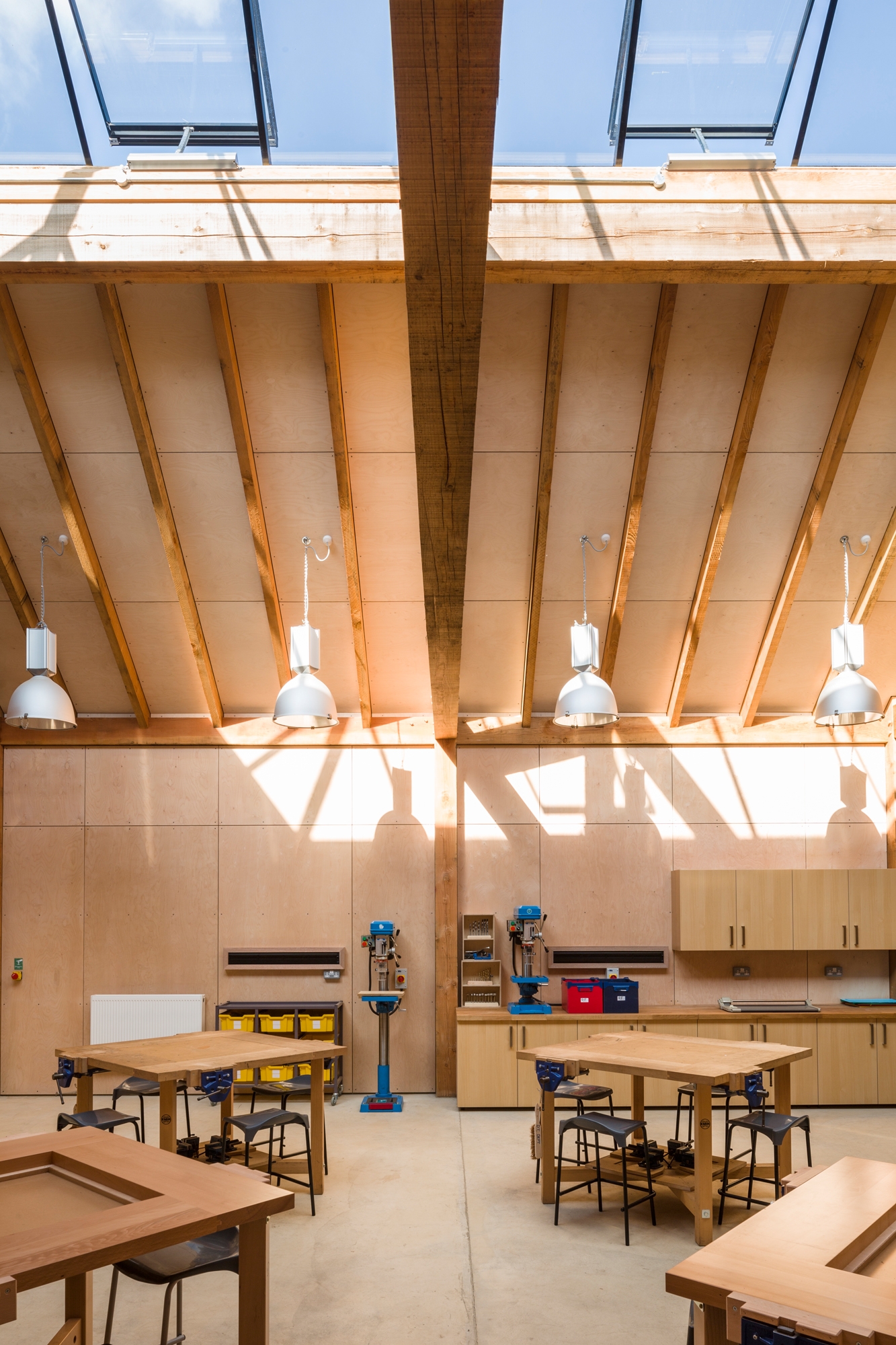 The dark external cladding provides a striking contrast to the light Douglas Fir timber interior. Here, traditional pegged mortise and tenon joints of the timber frame are counterpoised by steel hex-head fixings and sheets of birch-faced ply panels lining the walls, balancing tradition and modernity. The honesty of construction and robust interior provide a simple and practical backdrop for the workshop activities within. St James Design Technology Block was shortlisted for a 2015 FX international Design Award in the Public Sector.