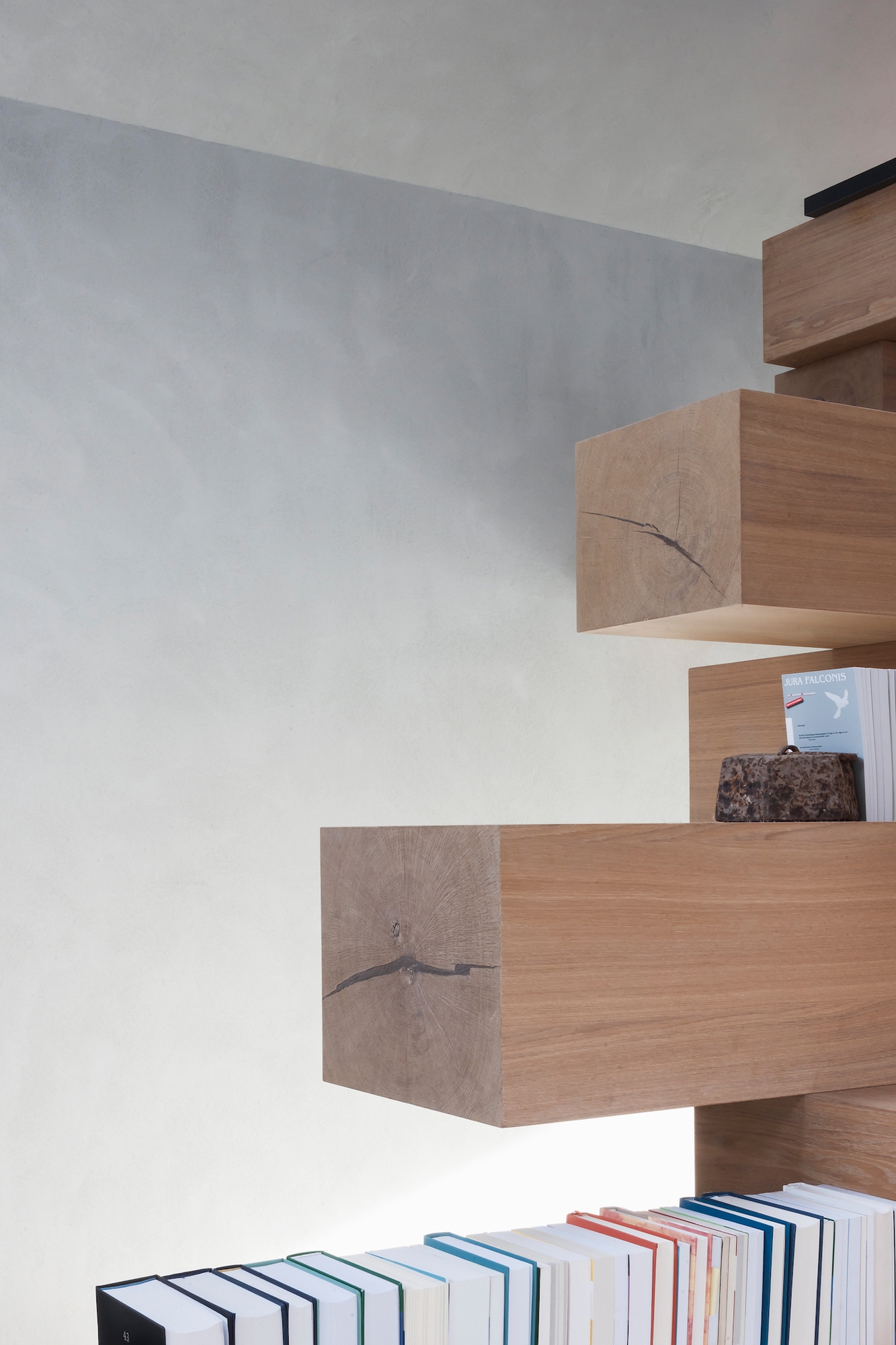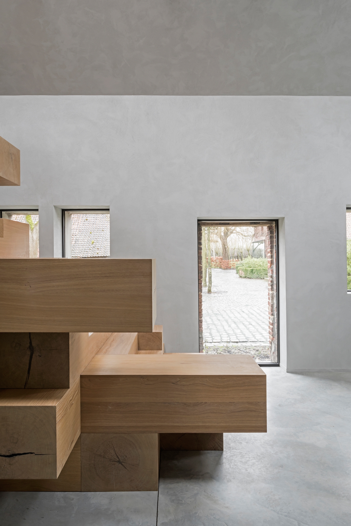 This extra object made out of stacked up wooden beams transforms the space into a very functional office. The wooden beams are piled up in such a way that different spaces arise. On the top several workspaces were created, accommodating two desks. Underneath the workspace-platform a meeting area is created, with a view onto the landscape. The stacked beams become the library, bookshelves, storage room and resting and reading area. The beams have been carved in this specific way to create a staircase to climb to the top workspace, and to reach the different beams on every level.