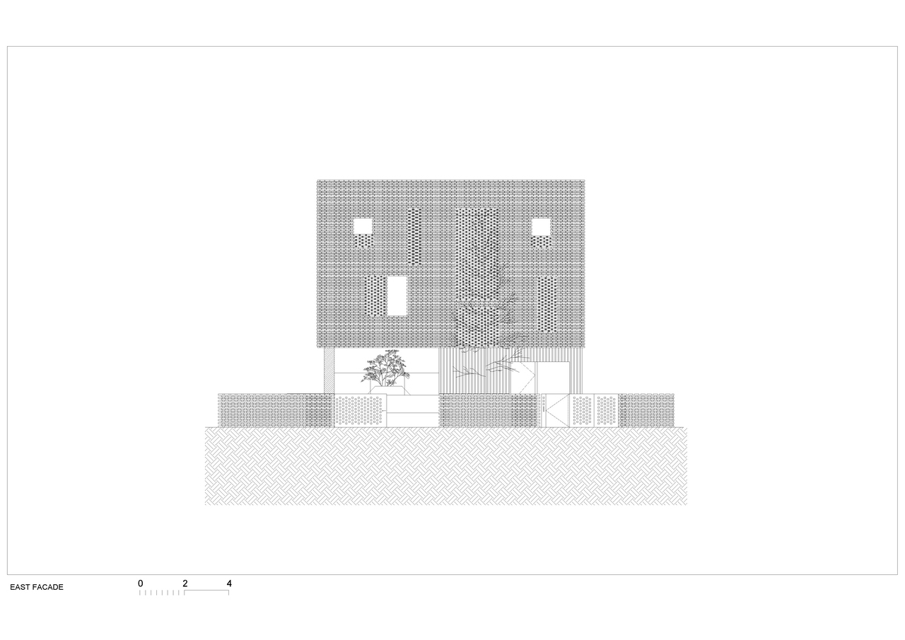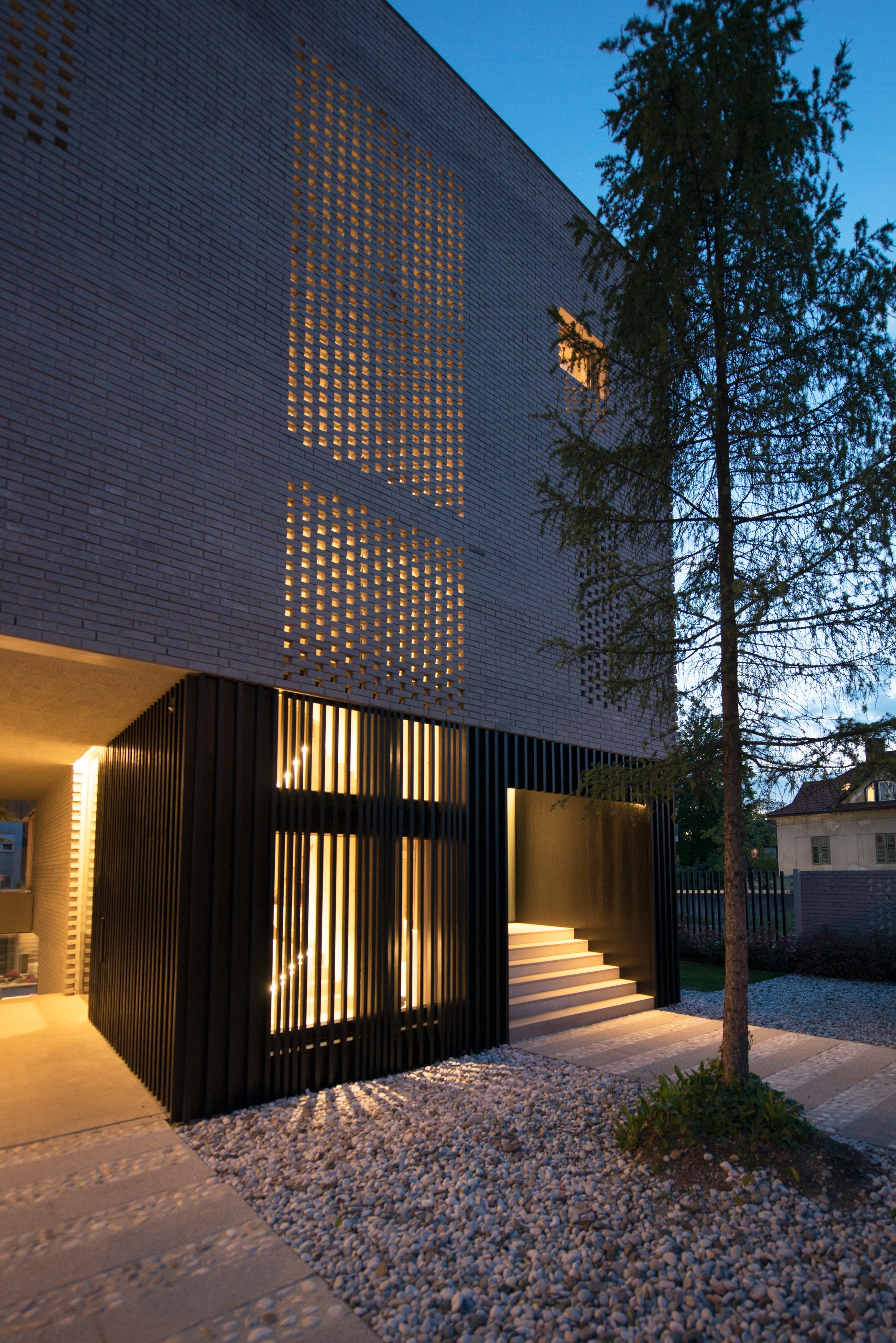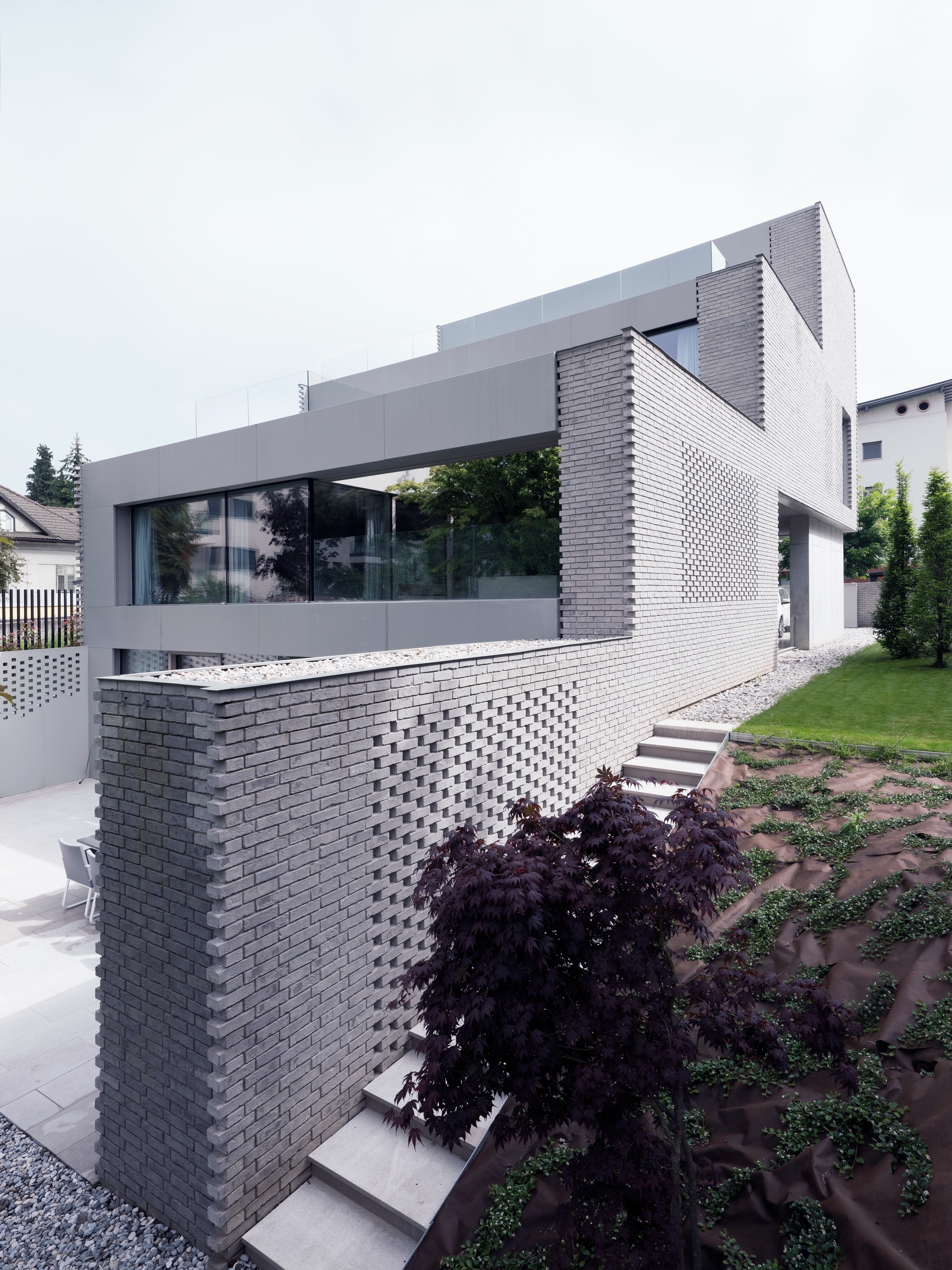 The resulting volume is wrapped in a perforated brick fabric in the exposed facades towards the street that act as a lattice and provides privacy while its back side is wide open glazed overlooking the several levels of private gardens.