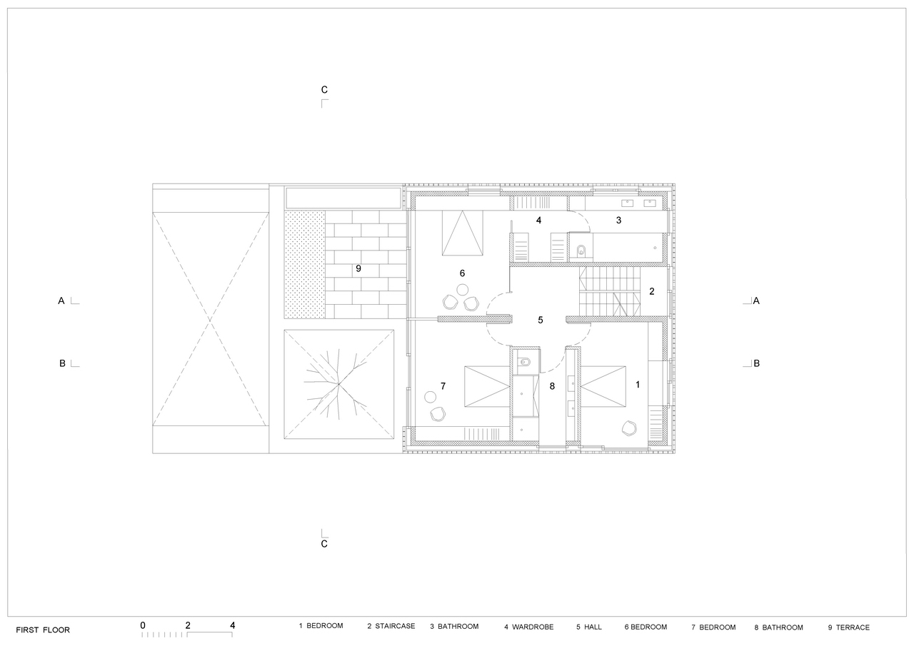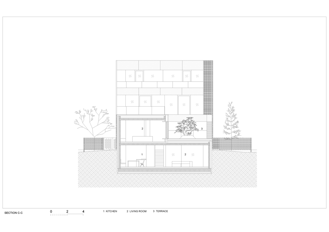 The house is located in a residential area in the border between the city center and suburban district. There is a difference in height of 2.5m between the level of the street and the further part of the lot. Following its topography, the volume of the house is divided into steps from the street to the garden level. This allows creating terraces with plants in every floor, overlooking the trees in the backyard garden.