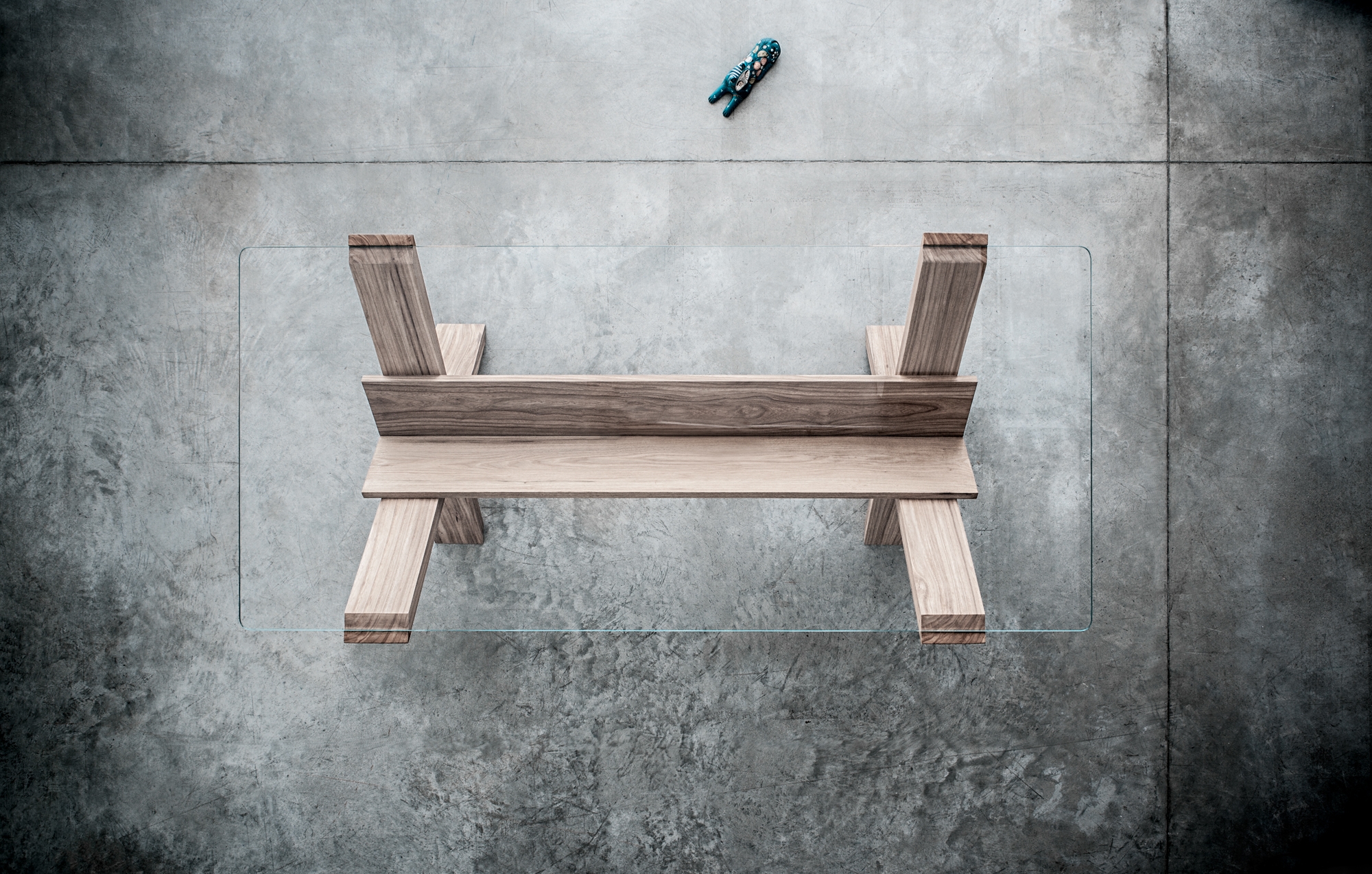 This table draws inspiration from the ship keel, rendered schematically by the V raised over X trestles. As the ship keel hollow part serves as boat hold, the V element can be used as container or display rack for different objects, according to what we use the table for.